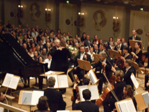 コンサートは、Gustavo Dudamel指揮、Staatskapelle Berlinによる演奏。一曲目はCharles IvesのRobert Browing Overtureという曲だった。現代曲でもあり、あまり理解できず。感想としては、「現代曲なんだなぁ・・・。」といった印象。二曲目は、Bela Bartokのピアノ協奏曲第1番だった。バルトークは、アイヴズと同時代の作曲家だが、こちらの方が聴きやすかった。バルトークの演奏は、バレンボイムのピアノ。バレンボイムは自然体で演奏していて、非常に音がクリアだった。ピアノが打楽器だと感じさせる演奏で、リズムが明確である分、この曲の良さが際だっていた。演奏が終わった後、カーテンコールが何度かあり、オケの女性団員が花束を贈呈した。その時交わしたキスシーンを写真に収めることが出来た。バレンボイムのキスシーンは貴重な一枚だ。一見パパラッチの様かもしれないが、演奏外では多くの観客が写真を撮っていたし、その中で偶然収めた一枚だ。拍手の中、バレンボイムは花束から花を1輪だけ抜いて、コンサートマスターに手渡した。何とも心憎い気配りだ。そして、何度も続くカーテンコールに、ピアノの鍵盤の上の蓋を閉めて、演奏が終わりであることを表現した。オシャレな伝え方だ。