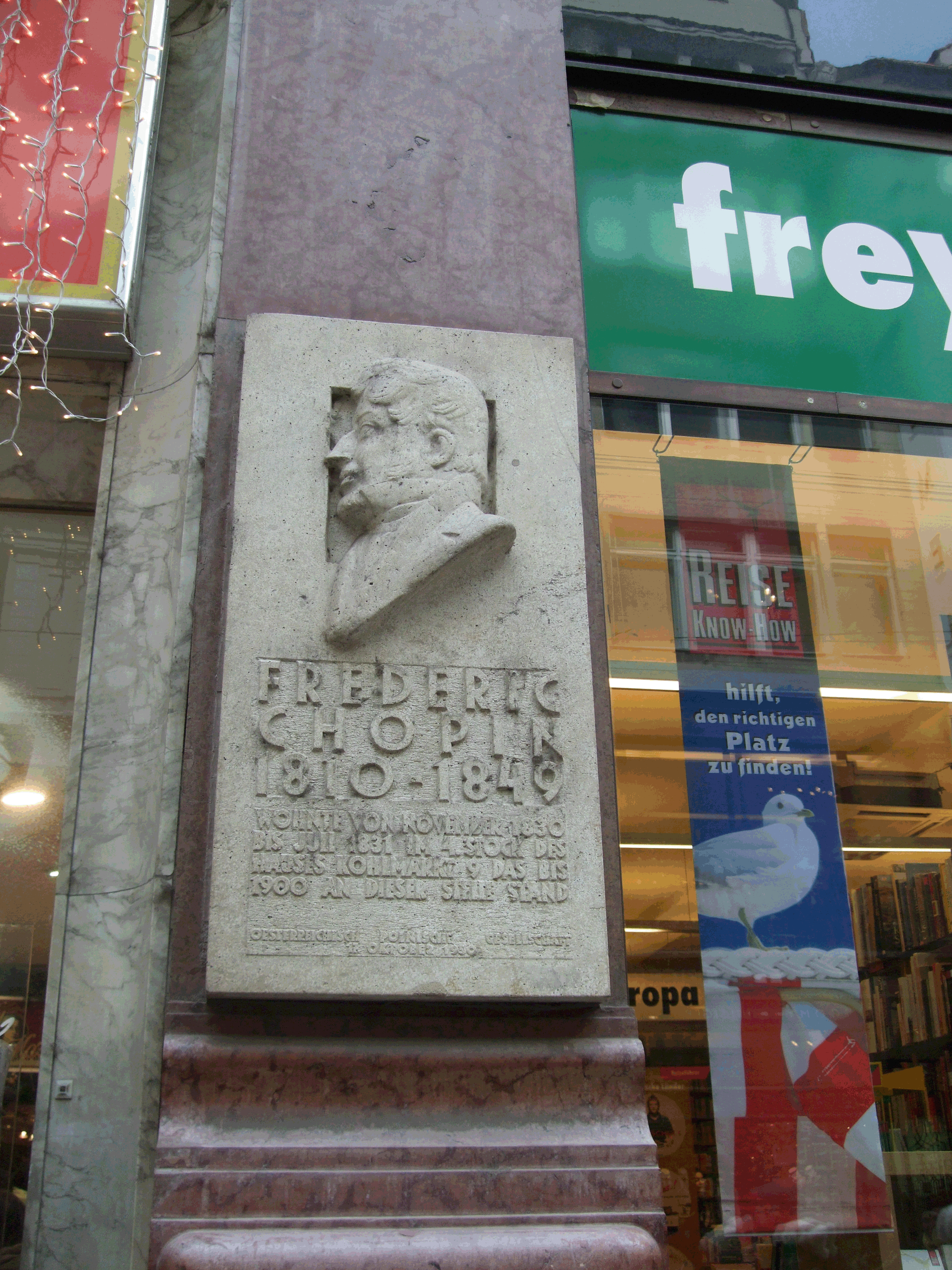 午前中はウィーン散策だ。これまでに何度も訪れたが、まだ見るところは色々ある。シュテファン寺院西部の Kohlmarkt通り沿いにショパンが住んでいた家があり、訪れると現在は土産物売り場になっていた。しかし、銘板には、ショパンが住んでいたことが記してあり、この建物で街がないことが確認できる。同じ通りのすぐ近くには、ハイドンが住んでいた家がある筈だが、残念ながらそのことが書かれた銘板を見つけることはできなかった。