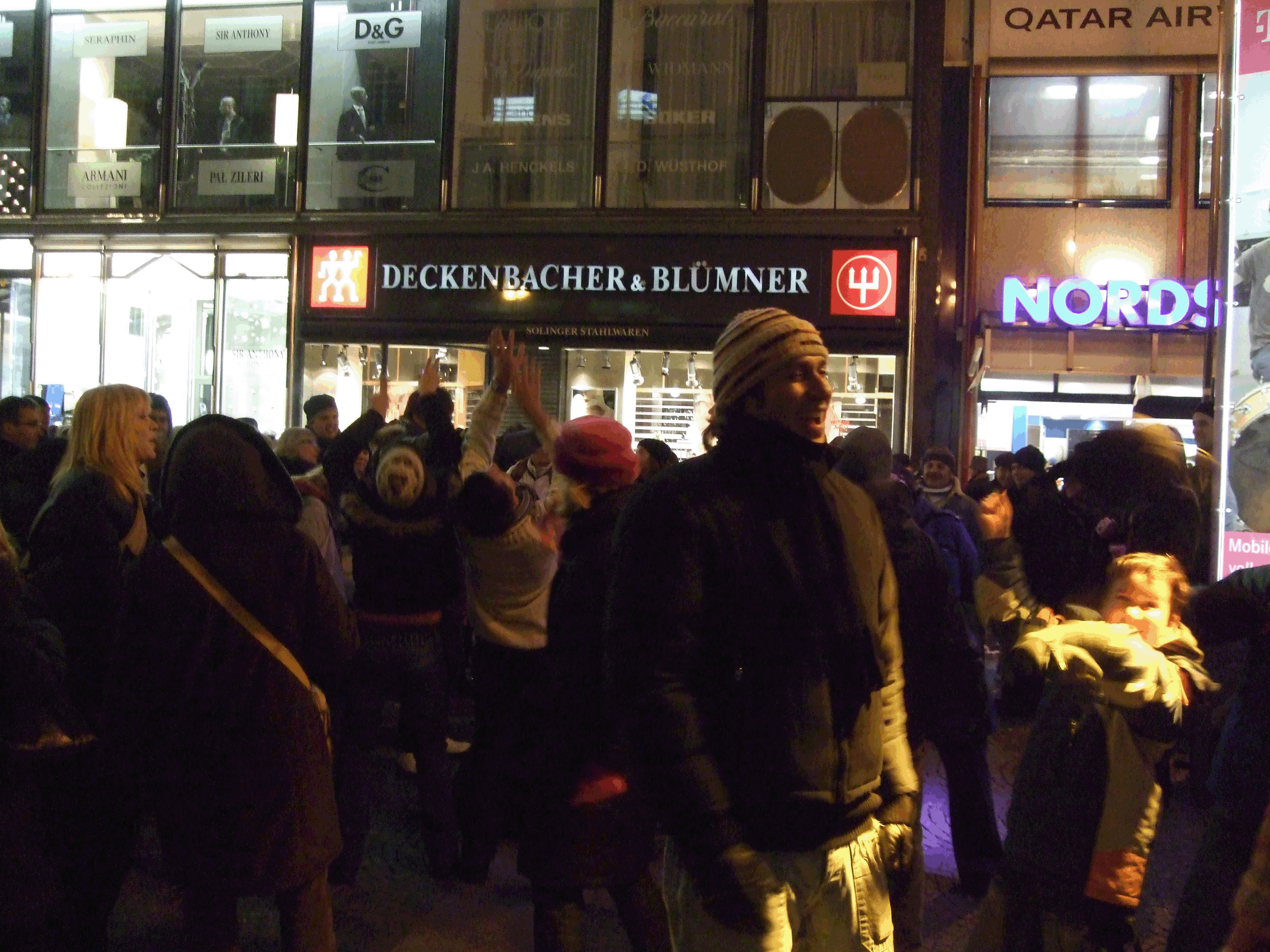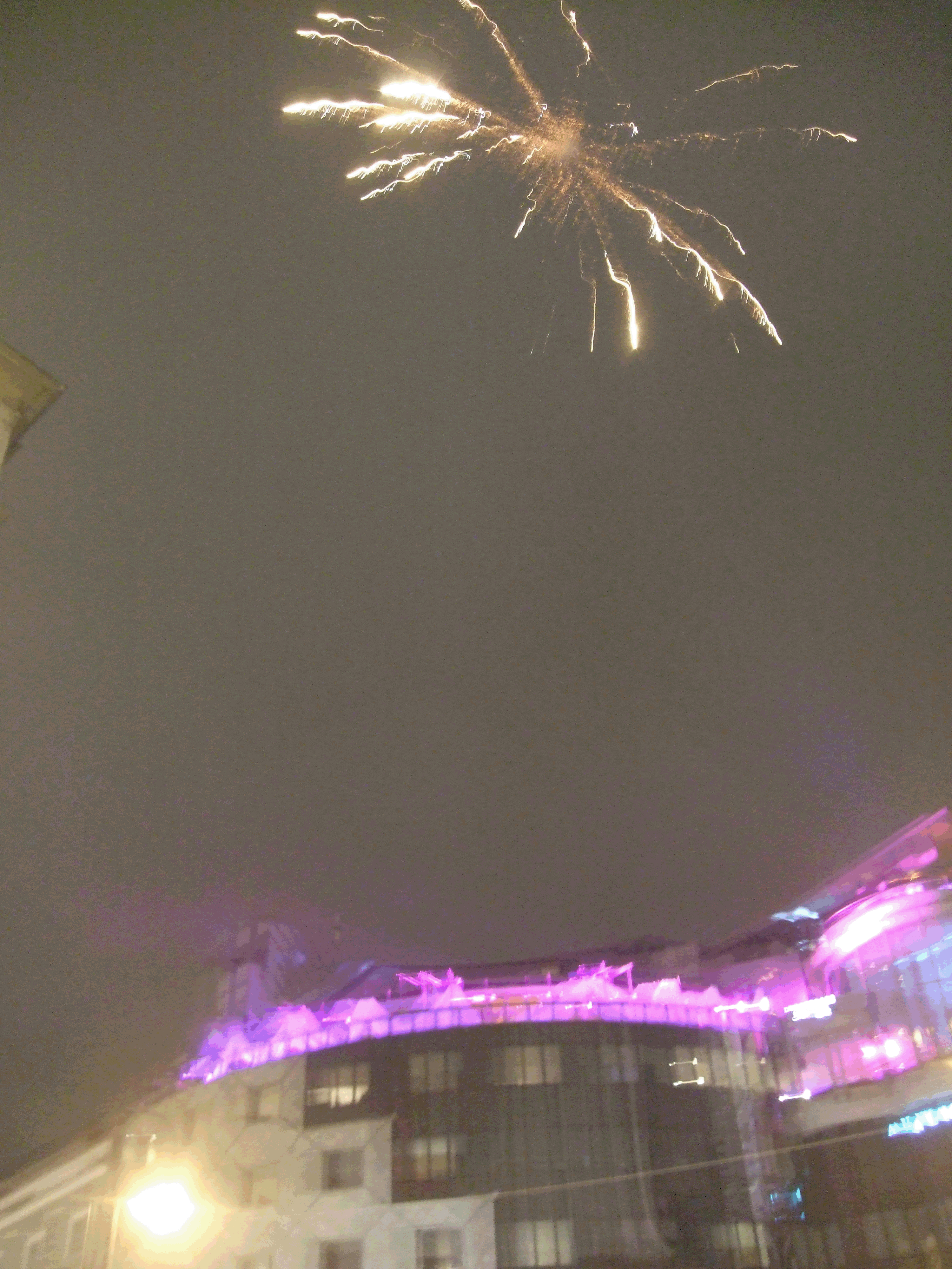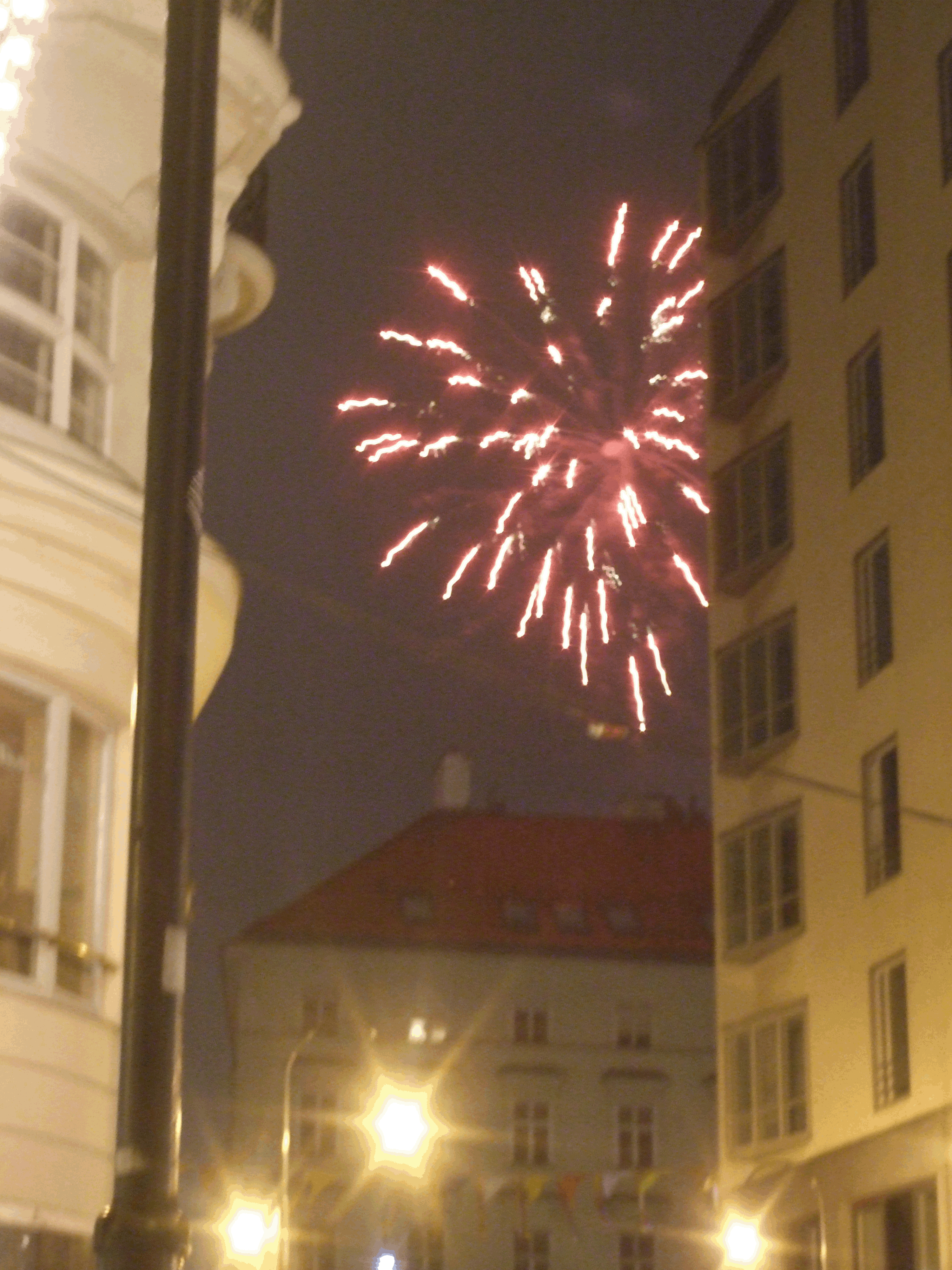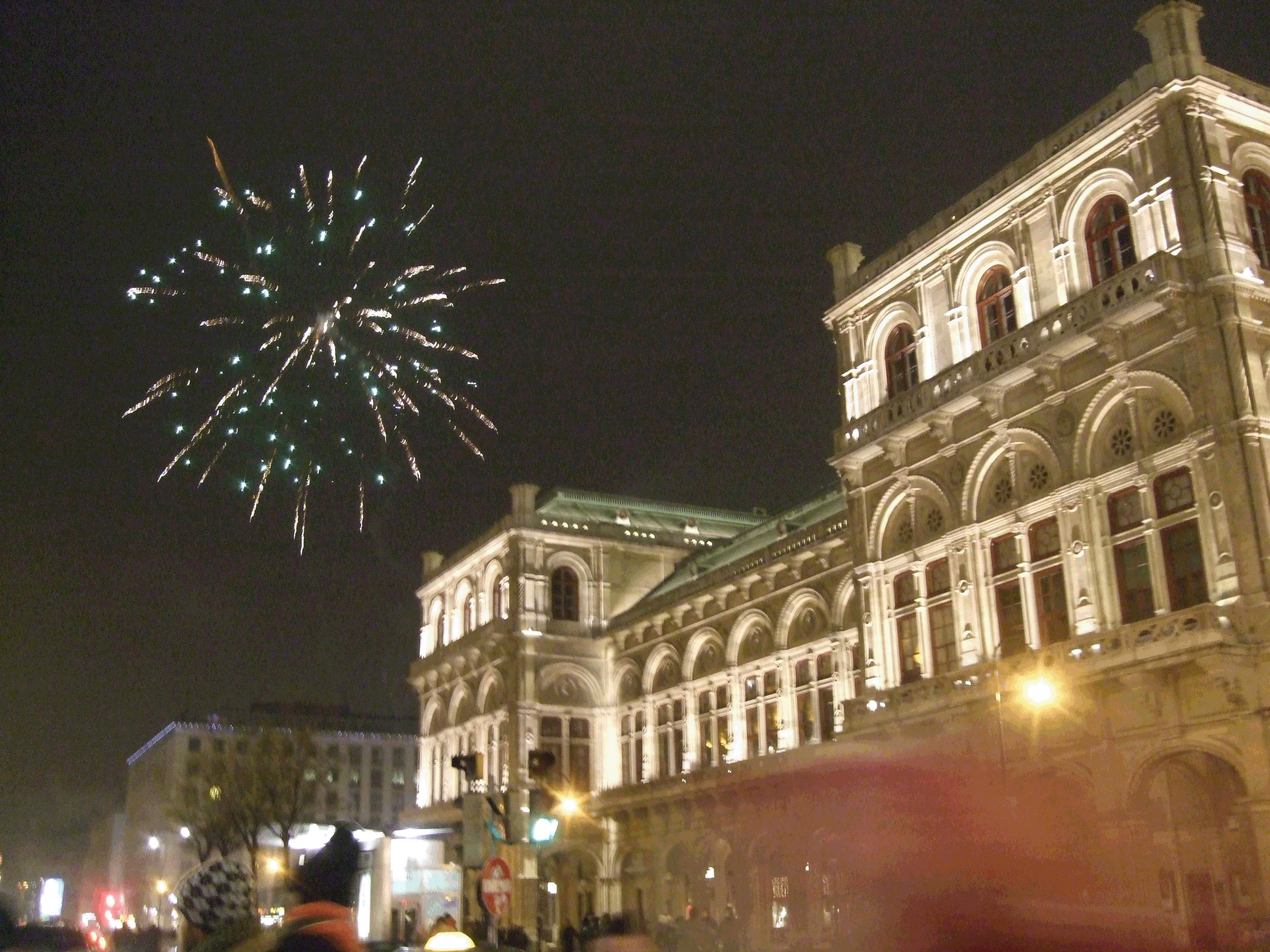 やがて、花火が上がり始めた。大晦日のカウントダウンはなく、みんなてんでバラバラに楽しんでいる。人ごみの中で爆竹が爆発し、その周囲に円ができている。帰り道では、別の場所で花火が上がっているのが見えた。街中が花火だ。中には、国立歌劇場目掛けてロケット花火を打ち込む者までいた。これがウィーンのジルベスターだ。ウィーンの人たちの陽気な一面が、一年で最も見られる時ではないだろうか (写真 1, 2, 3, 4, 5, 6, 7, 8, 9, 10, 11, 12)