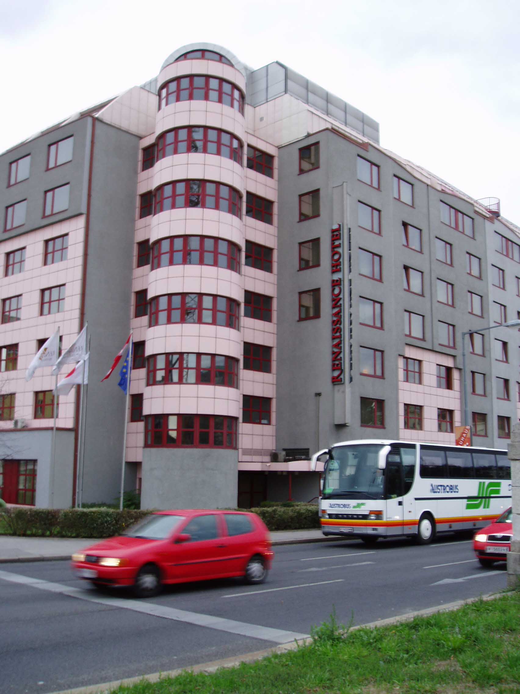 「VIENNA RENAISSANCE HOTEL」に到着後少しトラブルがあった。ホテル側が「そんな予約聞いていない」というのだ。でも案内人が予約の紙を見せ、ドイ ツ語ですごい勢いでまく し立てた。終いには「あなたじゃ埒が明かないわ。支配人が知り合いだからその人を出して。」とまで言っていた。最後には相手も納得し、予定通りチェックイ ンできた。「今日は何かと神経すり減らす日だなぁ」なんて思いながら。この案内人がいなくて俺一人だけだったとしたら、最悪の場合野宿するハメになったの ではないだろうか。