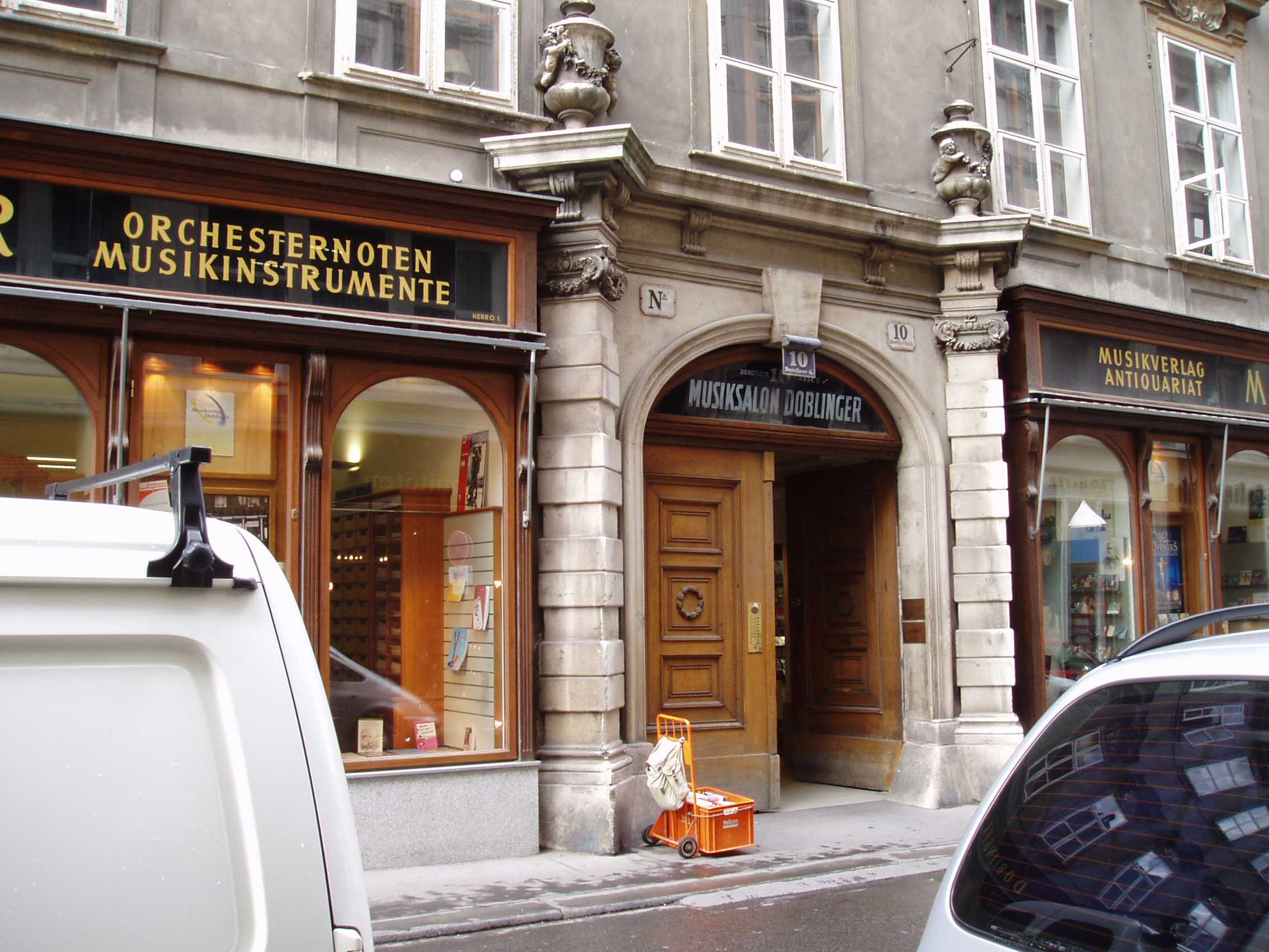 店で店員に地図を見せたが「わからない」といわれ、そのままさまようことに。縮尺の書いていない地図を持っていた事が災いしたようだ。1時間近く 歩き回ってようやく見つける事が出来た。ドアの上に横に「MUSIKSALON DOBLINGER」と書いてあり、入って左が楽譜屋、右がCD屋である。楽譜屋でまず人から頼まれていた楽譜を購入。楽器を持った音大生らしき人も多数 いる。残念ながらロマ音楽の楽譜は見つける事が出来なかったが、ウィンナーワルツの楽譜を数点購入。また、「ブランデンブルグ協奏曲全曲(バッハ)」「ピ アノソナタ h-mol(リスト)」、「ピアノソナタ op.101(ベートーヴェン)」のファクシミリ(作曲家自筆譜のコピー)を購入。相当な金額になったため、忘れず店員に「tax free, please」と伝えた。