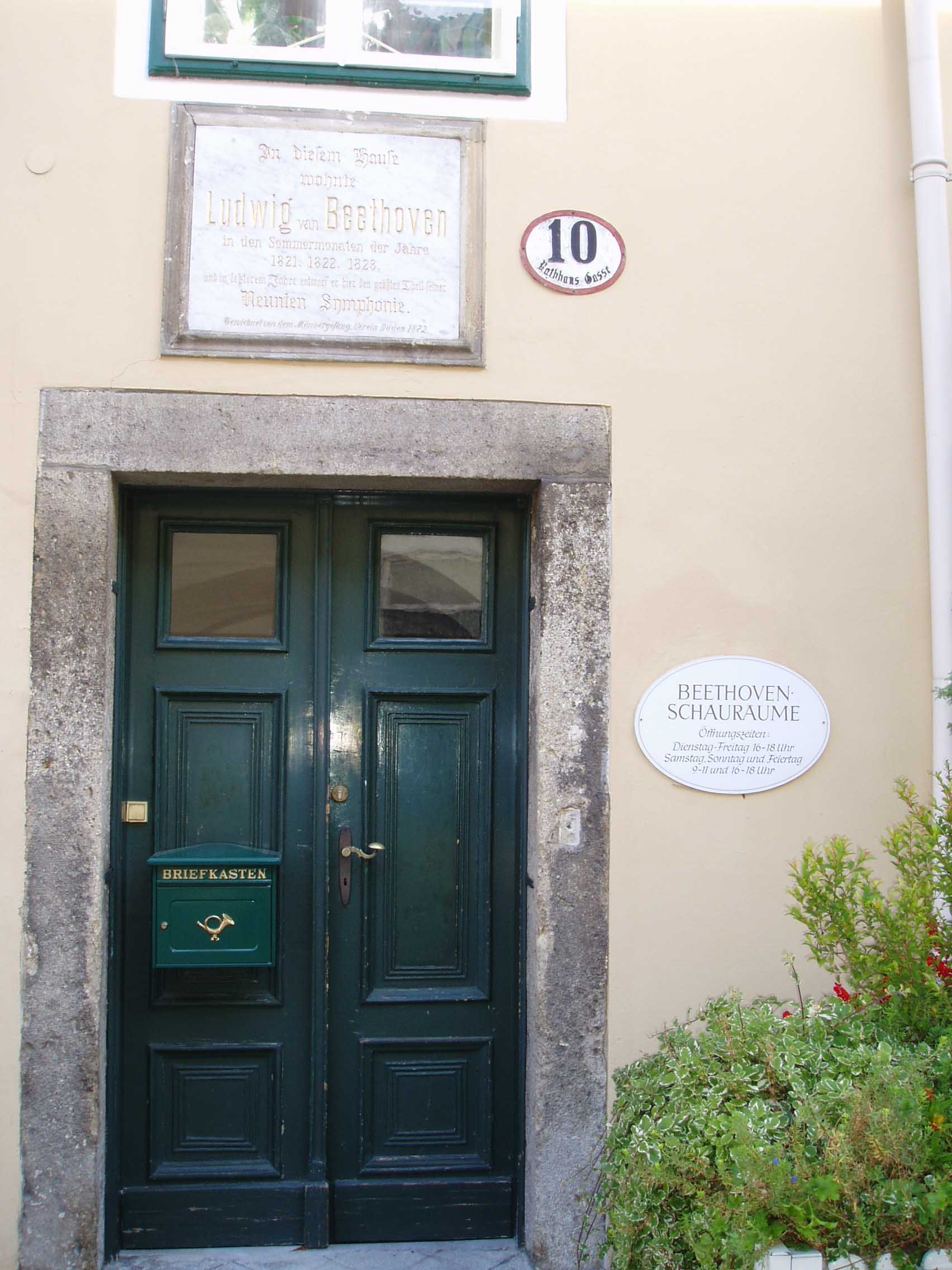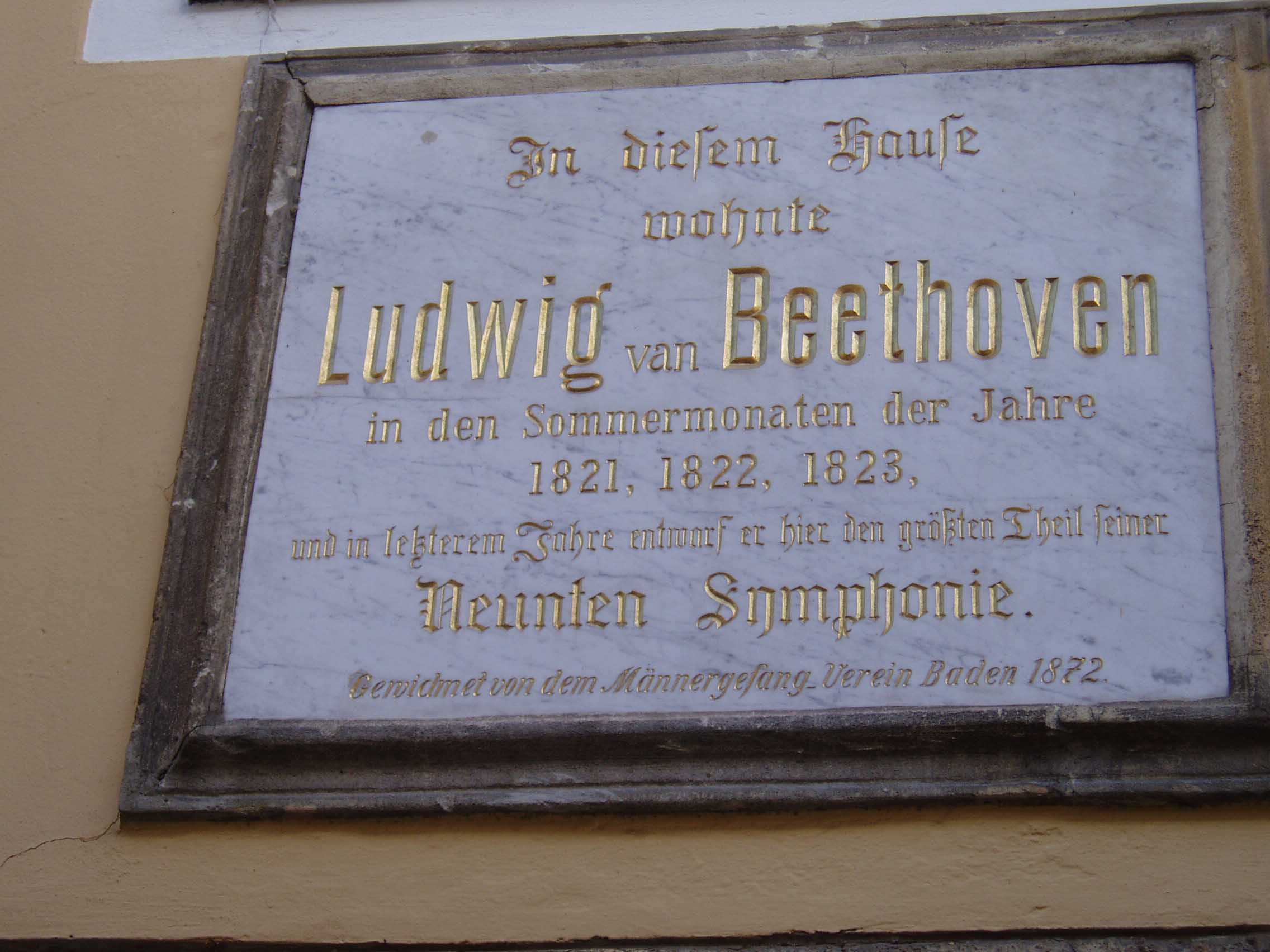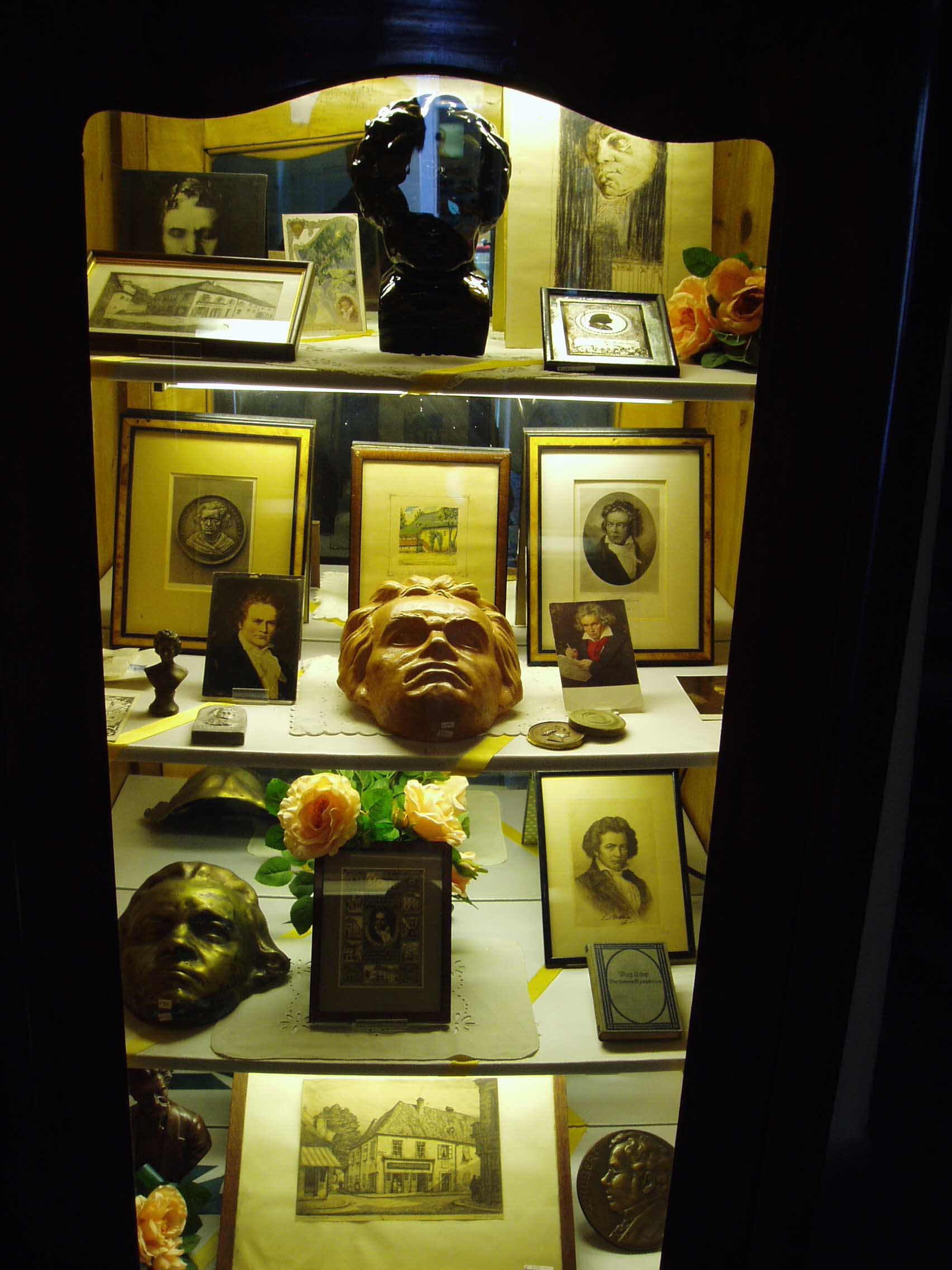目指すベートーヴェン博物館、別名 Kupferschmiedhaus(金細工師の家)に到着。当時の家主が金細工師だったためこの名がある。ドアの 上には銘板があり、「1821年、1822 年、1823年の夏、ルードヴィヒ・ヴァン・ベートーヴェンはこの家に住み、その最後の年に第九交響曲の構想の 大部分を固めた。バーデン男性合唱会により献呈 1872年」とある。ドアを入ると、まず大きなガラスケースがあり、ベートーヴェンのデスマス クを始め、 ベートーヴェンゆかりの品が収められている。そのまま階段をあがるともう一つドアがあり、そこを開けると受付だった。男性が座っており、挨拶をして入場料 をはらい、コートを脱ぎ楽器を置く。そこはベートーヴェンが住んでいた当時玄関だった部屋の筈だ。次の部屋に進むと、壁にコートがかけてあり「ベートー ヴェンが着ていたかもしれないコート」と横に書いてある。そしてその奥にベートーヴェンの寝室が再現されている。受付の男性が気を利かせて博物館中に聞こ えるように第九のCDを流してくれているのを聞きながら鑑賞に浸る。客は俺一人しかいない。目を閉じて見る。こんな情景はどうだろうか?「雨の中馬車にゆ られて帰ってきたベートーヴェンはコートを壁にかけた。彼の頭の中には第九の1楽章が流れている。彼はベッドの上に横になり、天井を眺める。いくつものア イデアが浮かんでは消えていく・・・。」