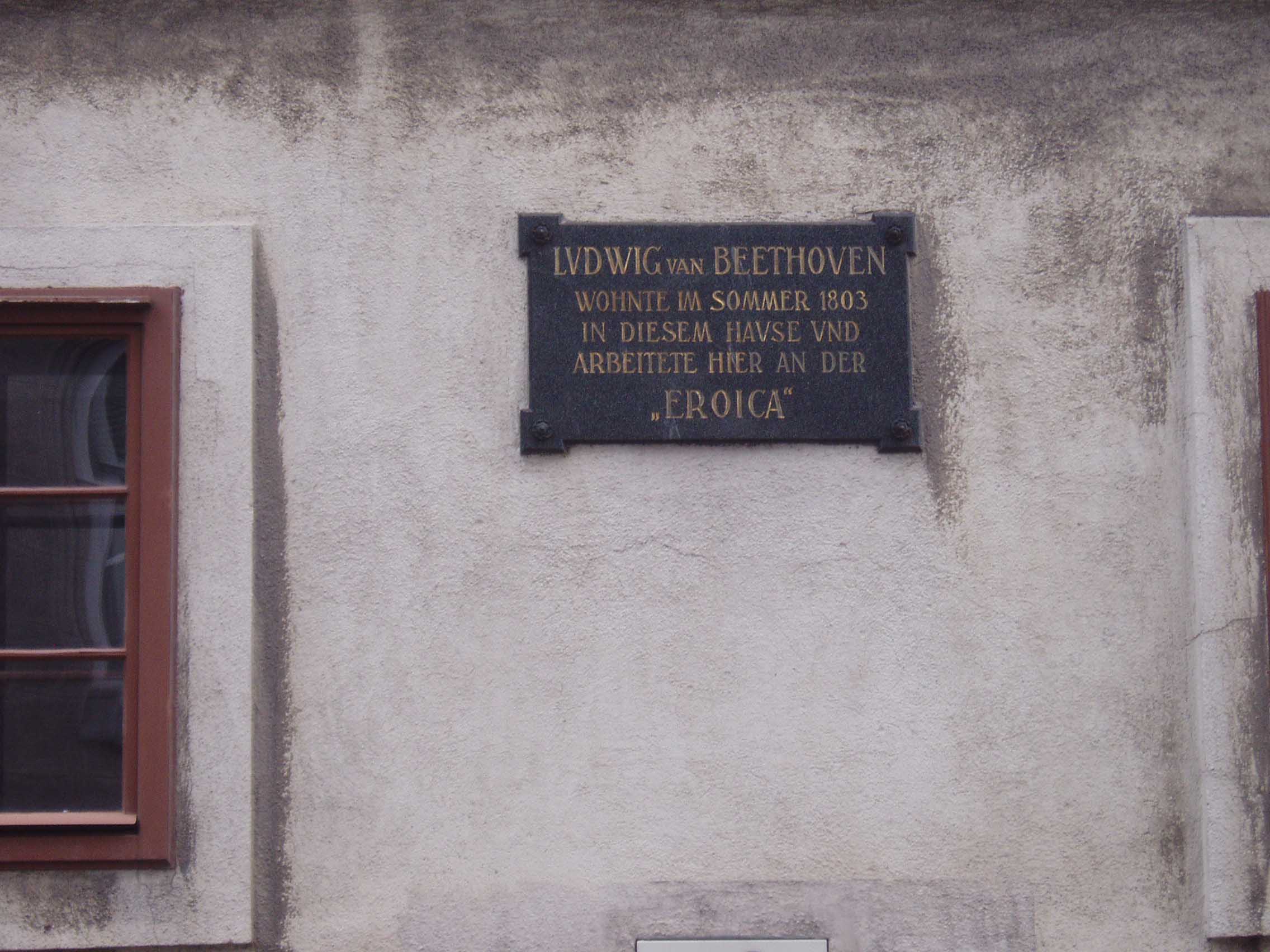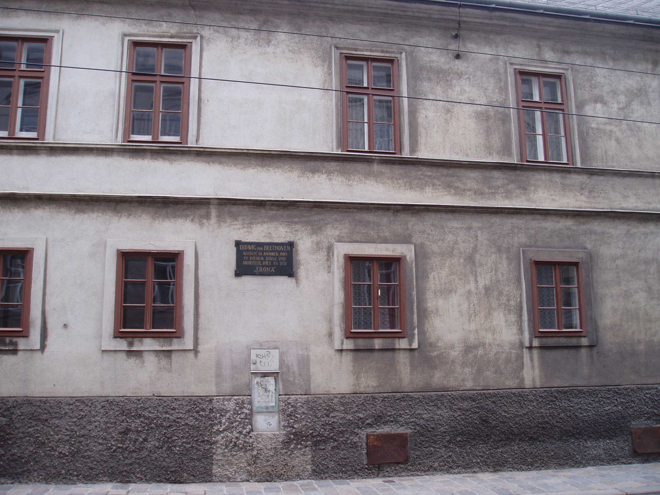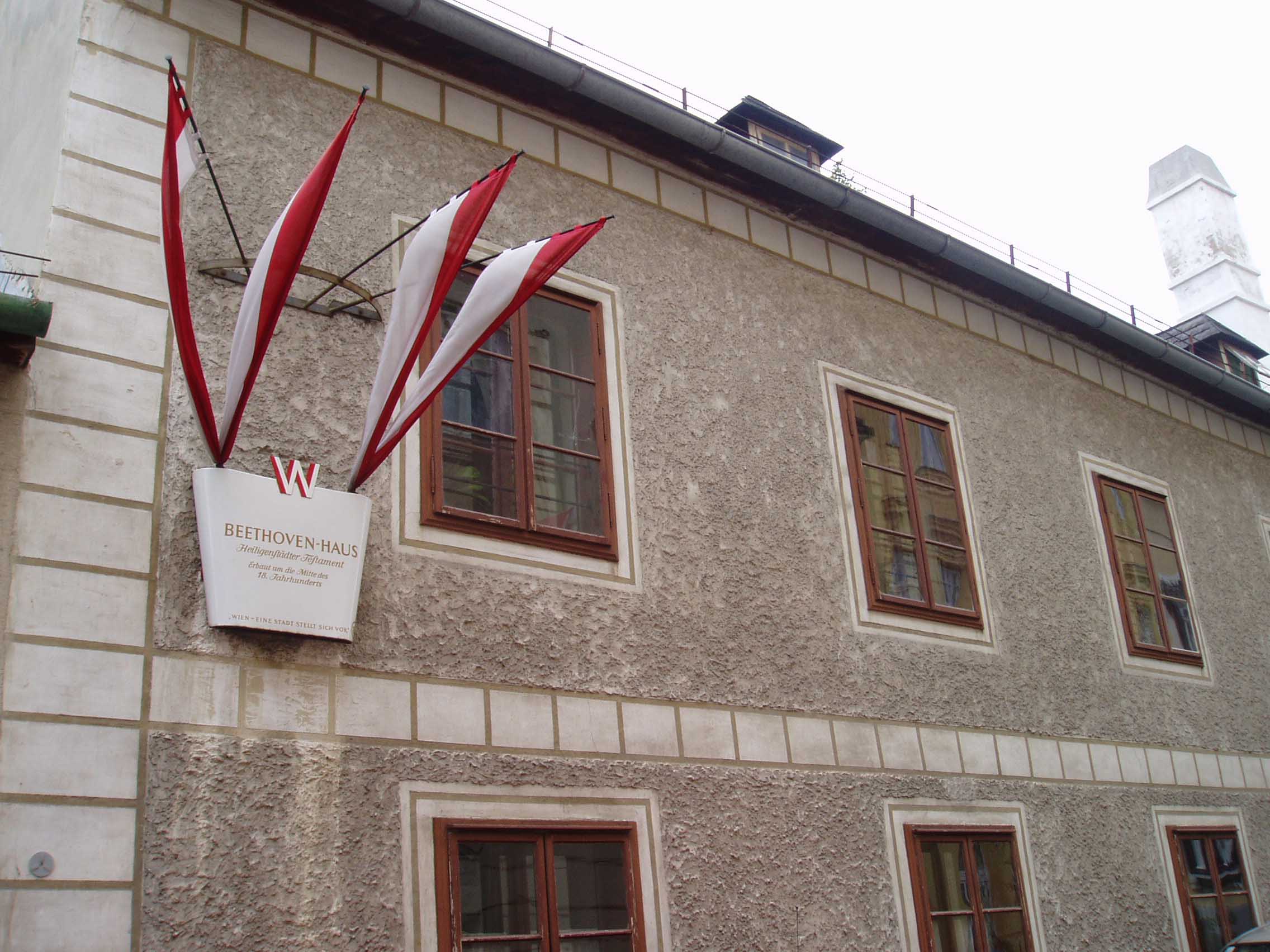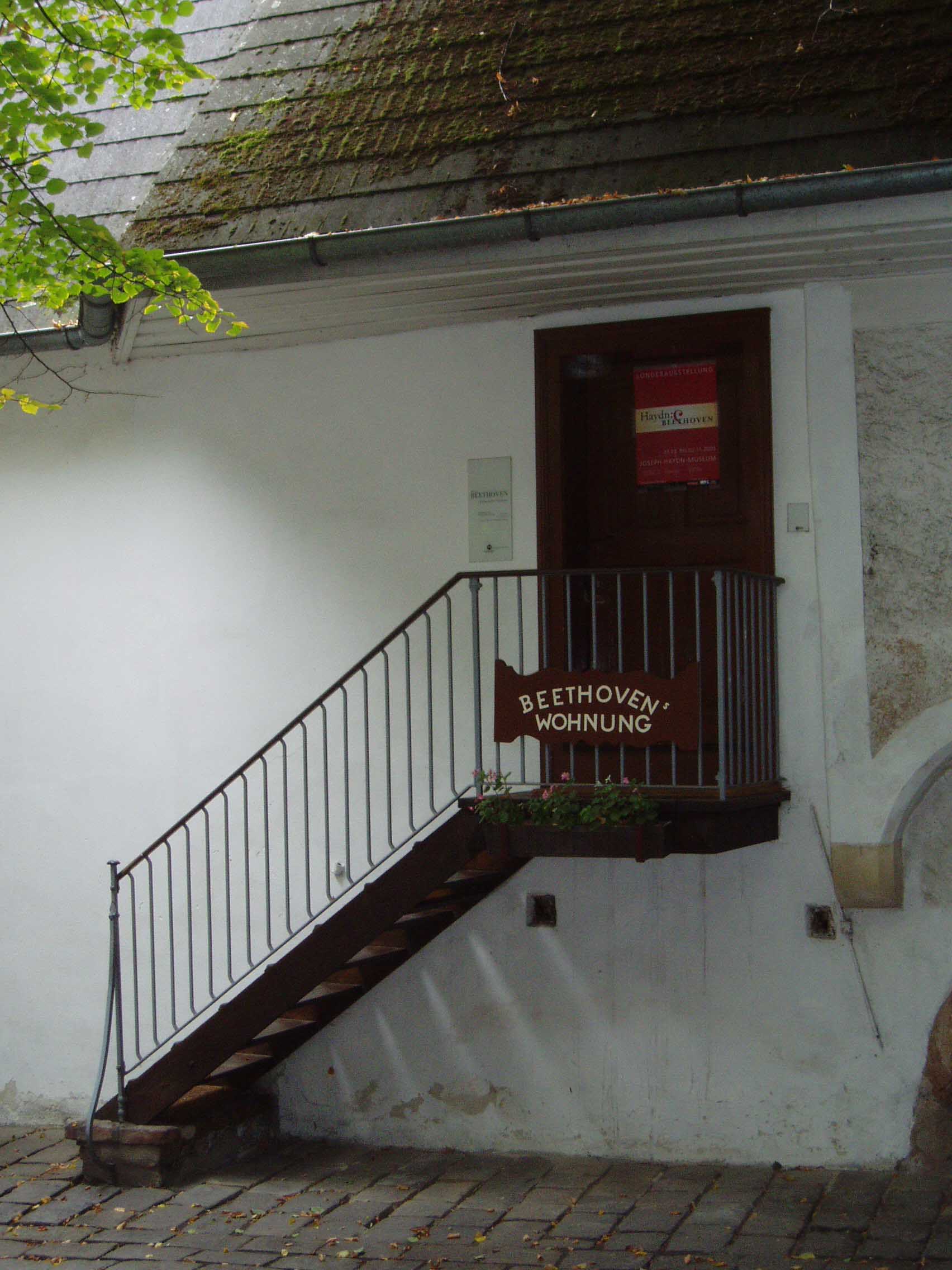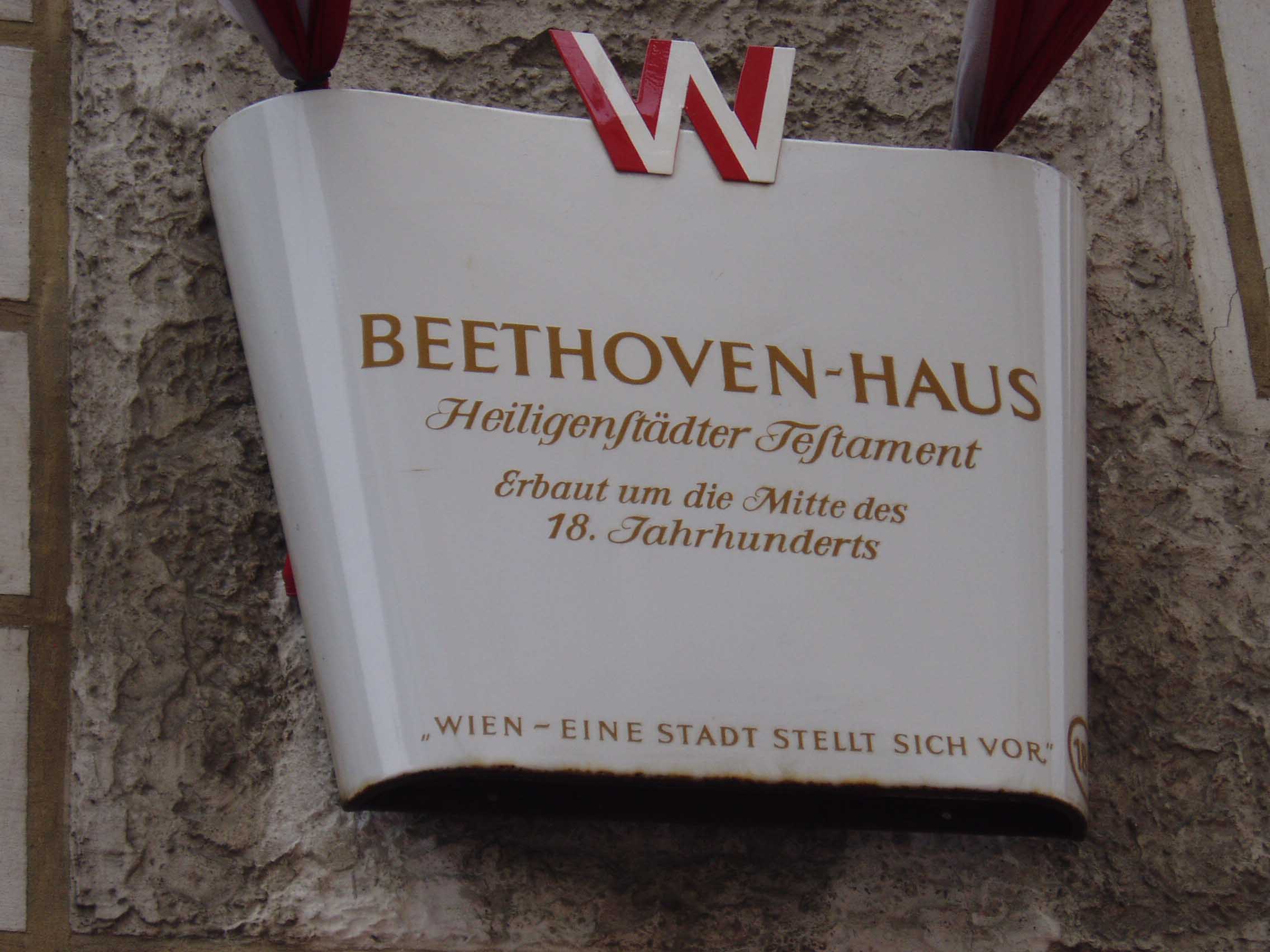 そこから約数百mのところに「ハイリゲンシュタット 遺書の家」と呼ばれる家がある。建物の壁には銘板が あった。門を入る。しかし丁度、受付の昼休みという ことで入場はできないことになってお り、近くで昼食を摂ることにした。すぐの所に老人ホームがあり、一角がレストランだったので入り、ランチを食べた。ウィーンは老人ホームも時間がゆっくり している。「ハイリ ゲンシュタット遺書の家」に戻ると受付の人 が戻ってきており、無事入場できた。客は私一人でゆっくり見られると思ったのだが、受付の男がロックをラジカセ で大音量で聴いていたため、雰囲気が台無しになってしまった。しかし、最近の研究では、ベートーヴェンが遺書を書いた家ではないという説が有力である。