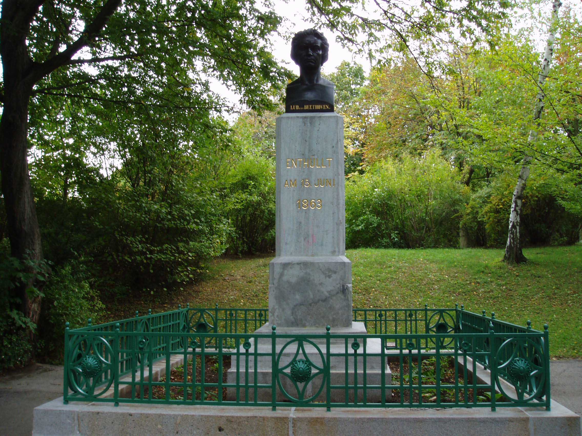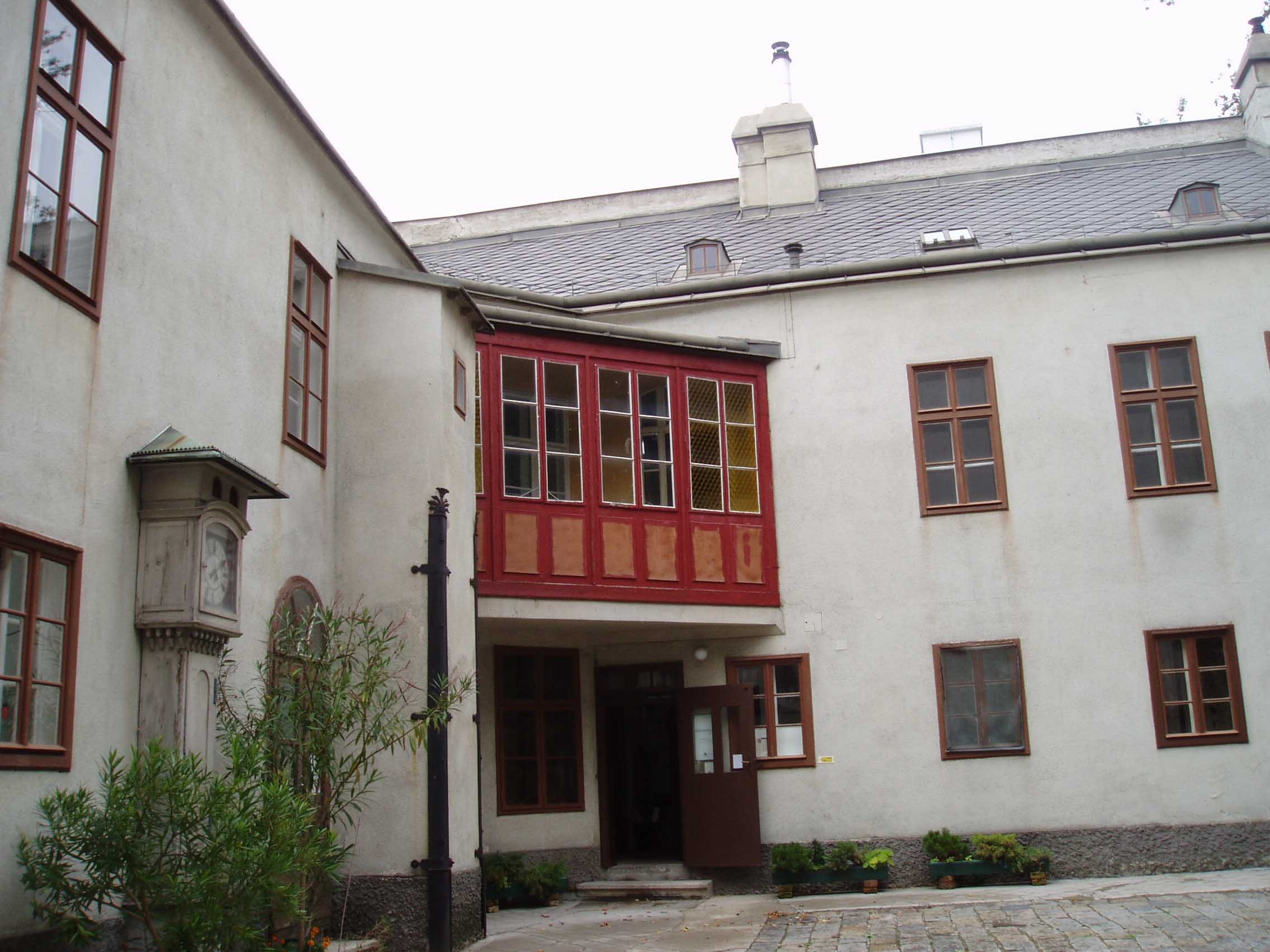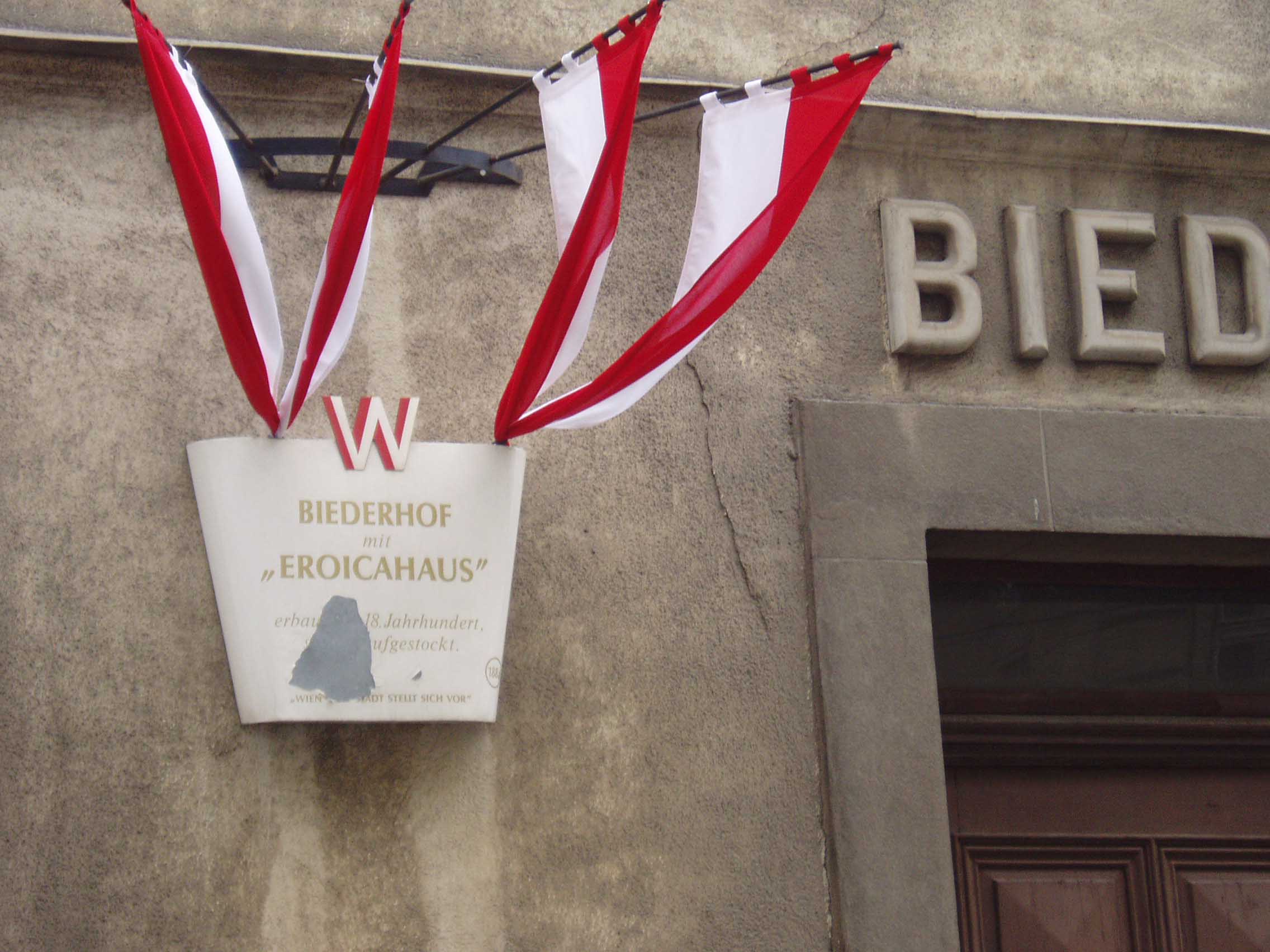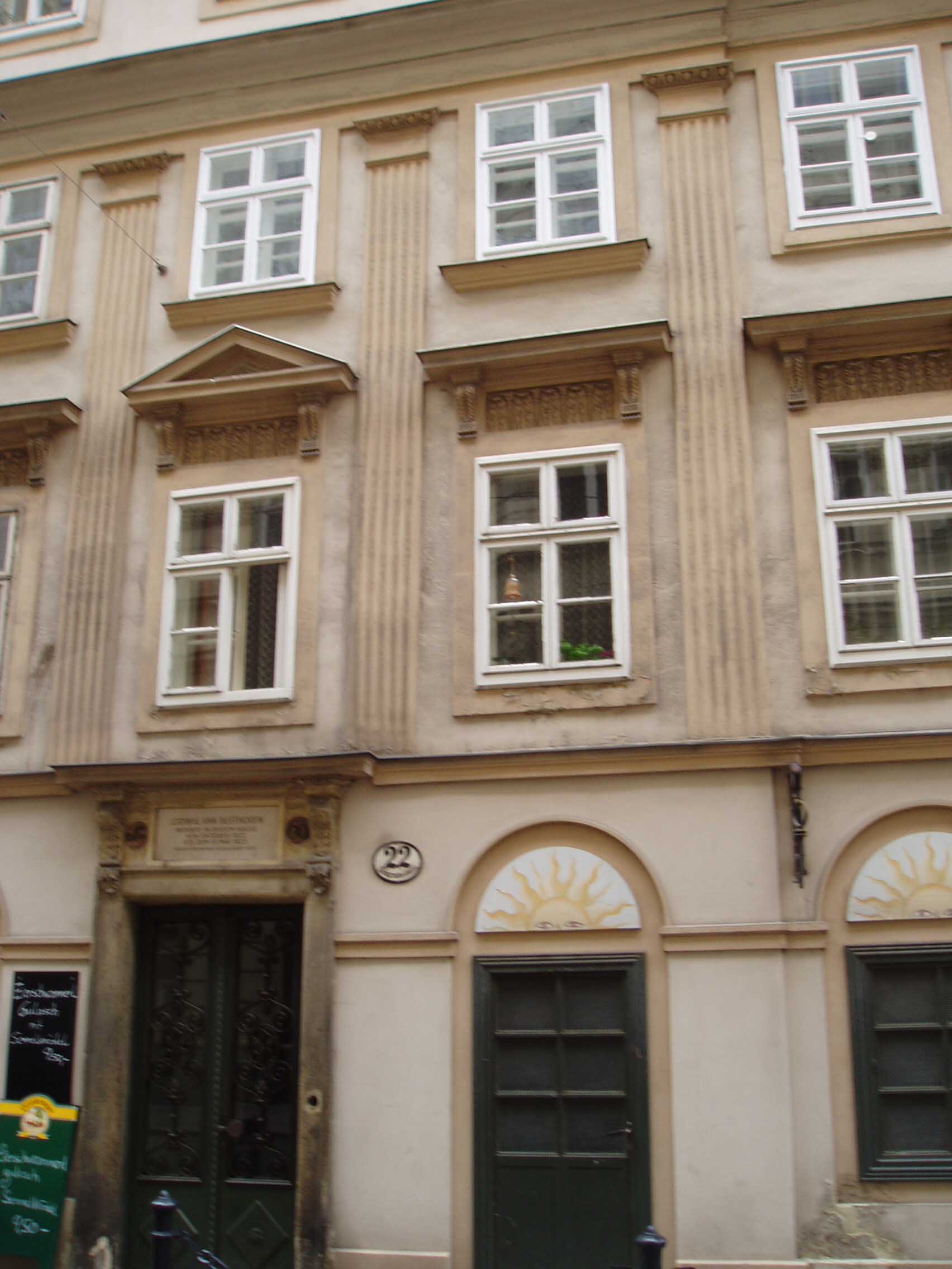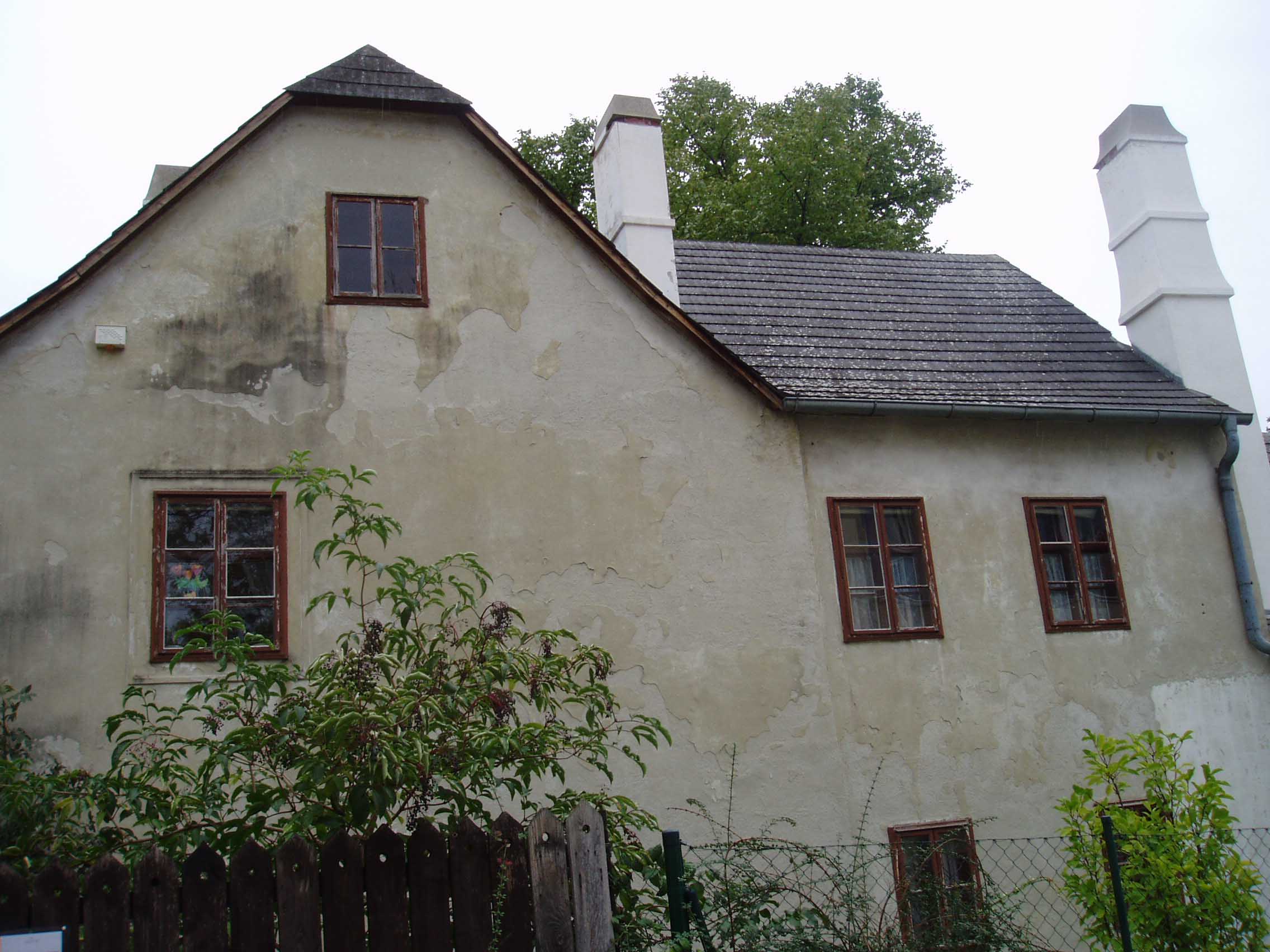そこから約数百mのところに「ハイリゲンシュタット 遺書の家」と呼ばれる家がある。建物の壁には銘板が あった。門を入る。しかし丁度、受付の昼休みという ことで入場はできないことになってお り、近くで昼食を摂ることにした。すぐの所に老人ホームがあり、一角がレストランだったので入り、ランチを食べた。ウィーンは老人ホームも時間がゆっくり している。「ハイリ ゲンシュタット遺書の家」に戻ると受付の人 が戻ってきており、無事入場できた。客は私一人でゆっくり見られると思ったのだが、受付の男がロックをラジカセ で大音量で聴いていたため、雰囲気が台無しになってしまった。しかし、最近の研究では、ベートーヴェンが遺書を書いた家ではないという説が有力である。