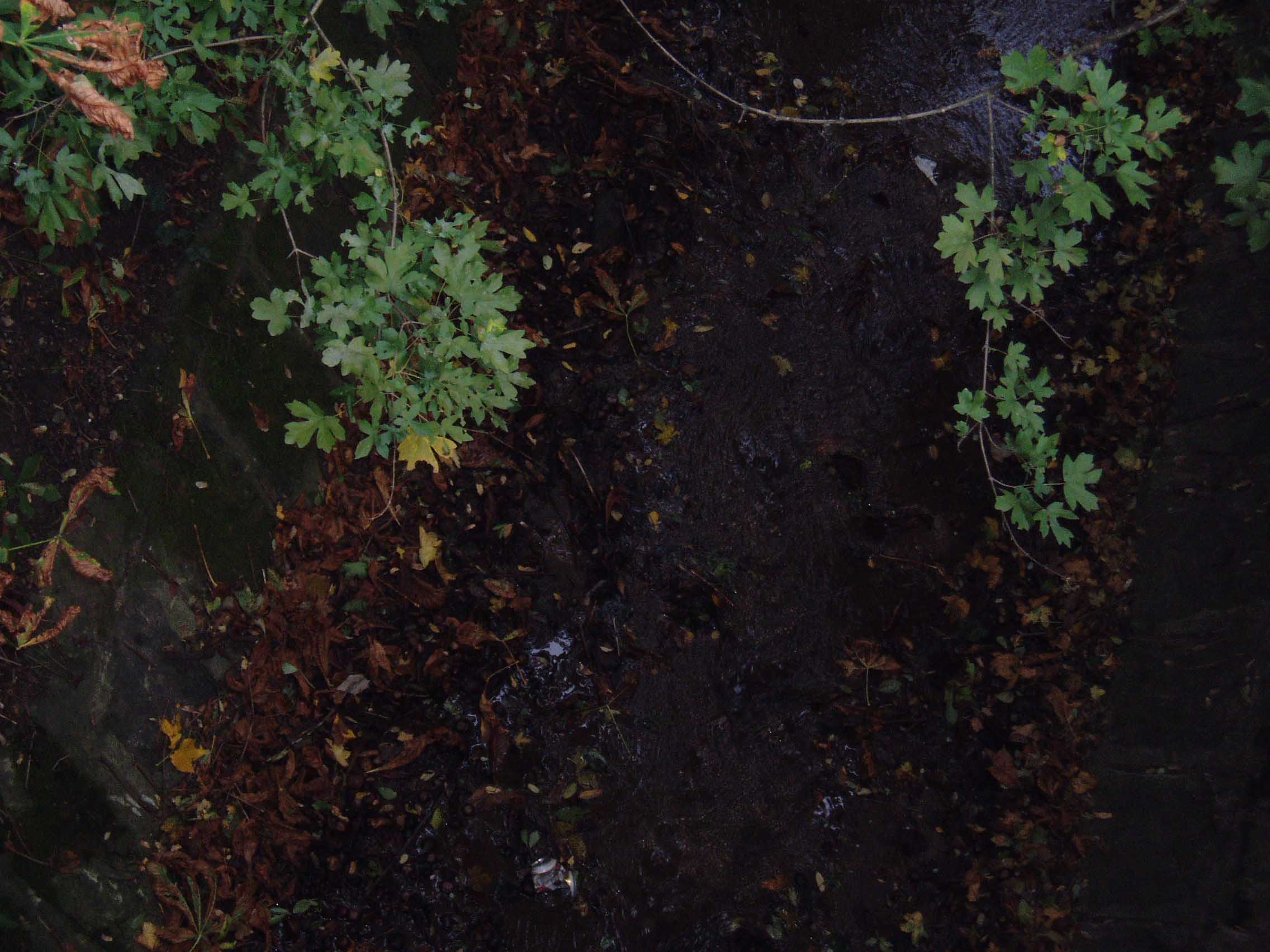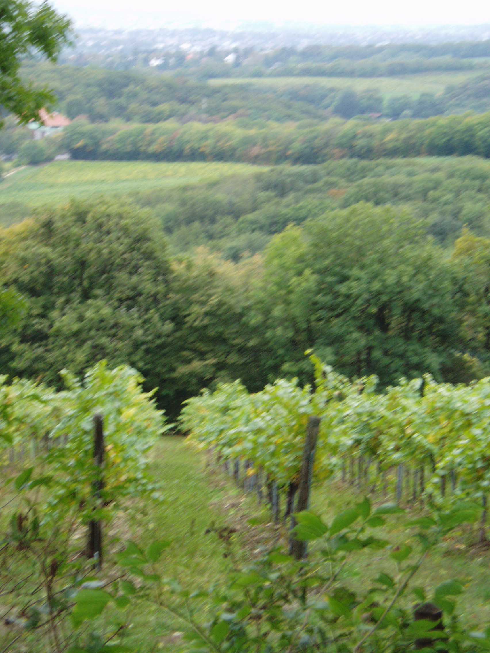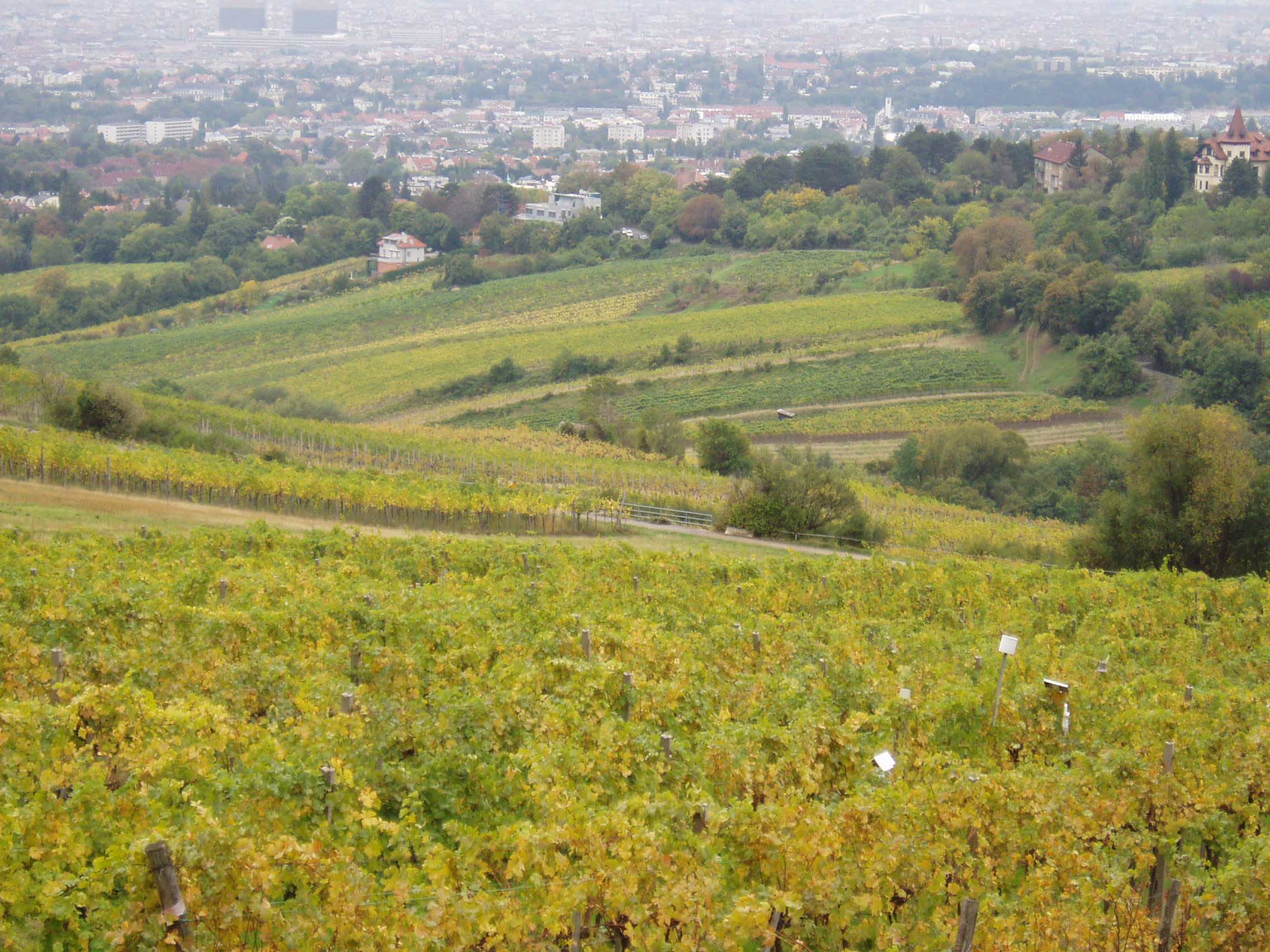 この通りを下っていくと、最初は木々に囲まれた道であったが、次第に葡萄畑が開けてきた。葡萄畑越しにウィーンの街が見える。 何を示しているかわからない標識を横目に坂道を下る。 さっきより随分町並 みが近づいてきている。振り返ると葡萄畑越しに山々が 見える。朝はかなり冷え込むのだが、まだ紅葉は見られない。途中、葡萄畑で収穫中の人と会い、挨拶を 交 わす。と、途中から 小川が姿を現した。シュライバーバッハといい、ベー トーヴェン「田園」交響曲のモチーフとなった川だ。
