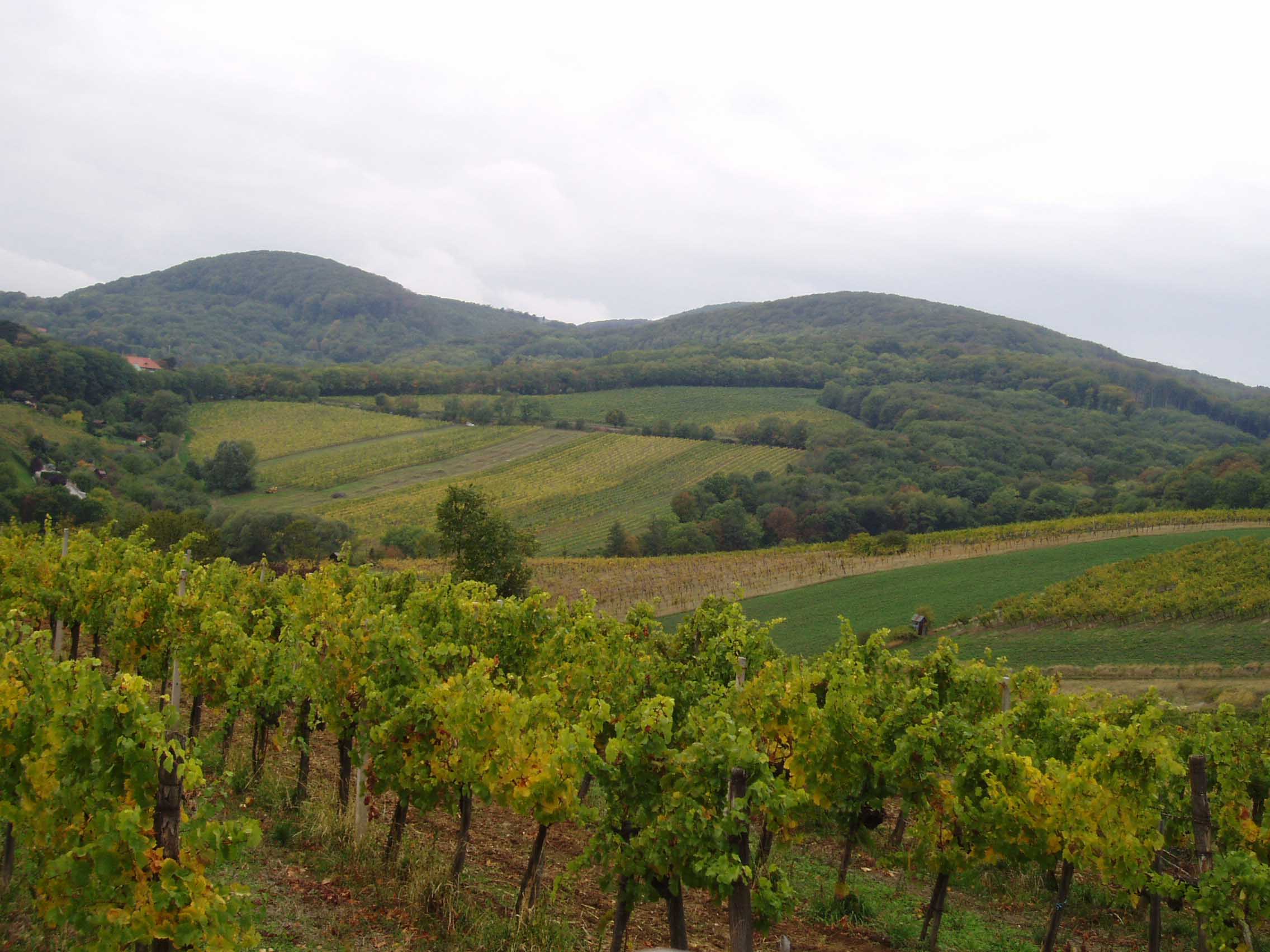 に広がるブドウ畑と、丘を下った先にあるドナウ河。