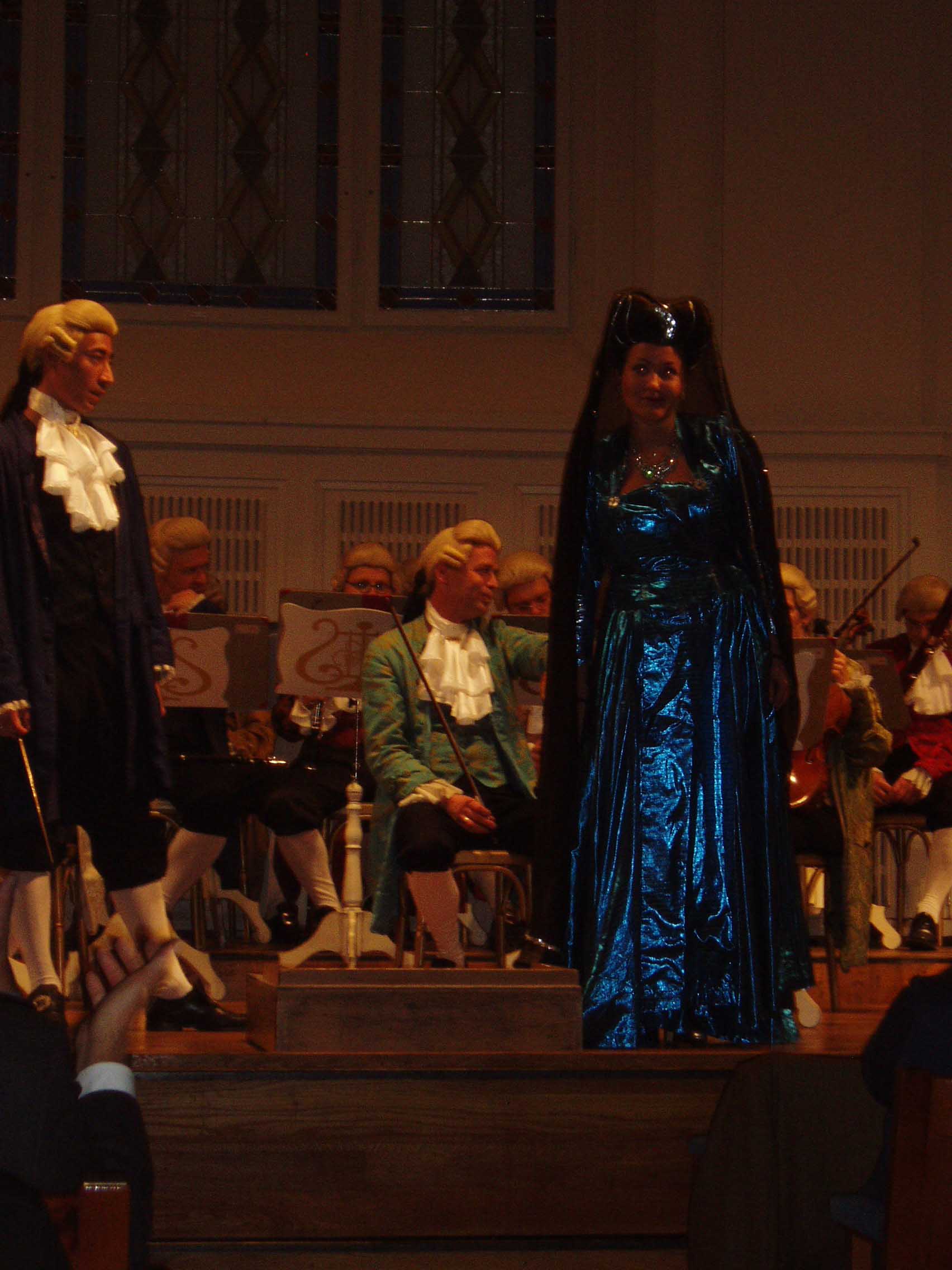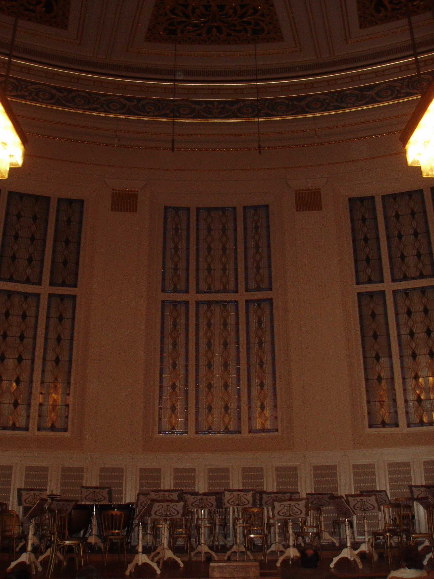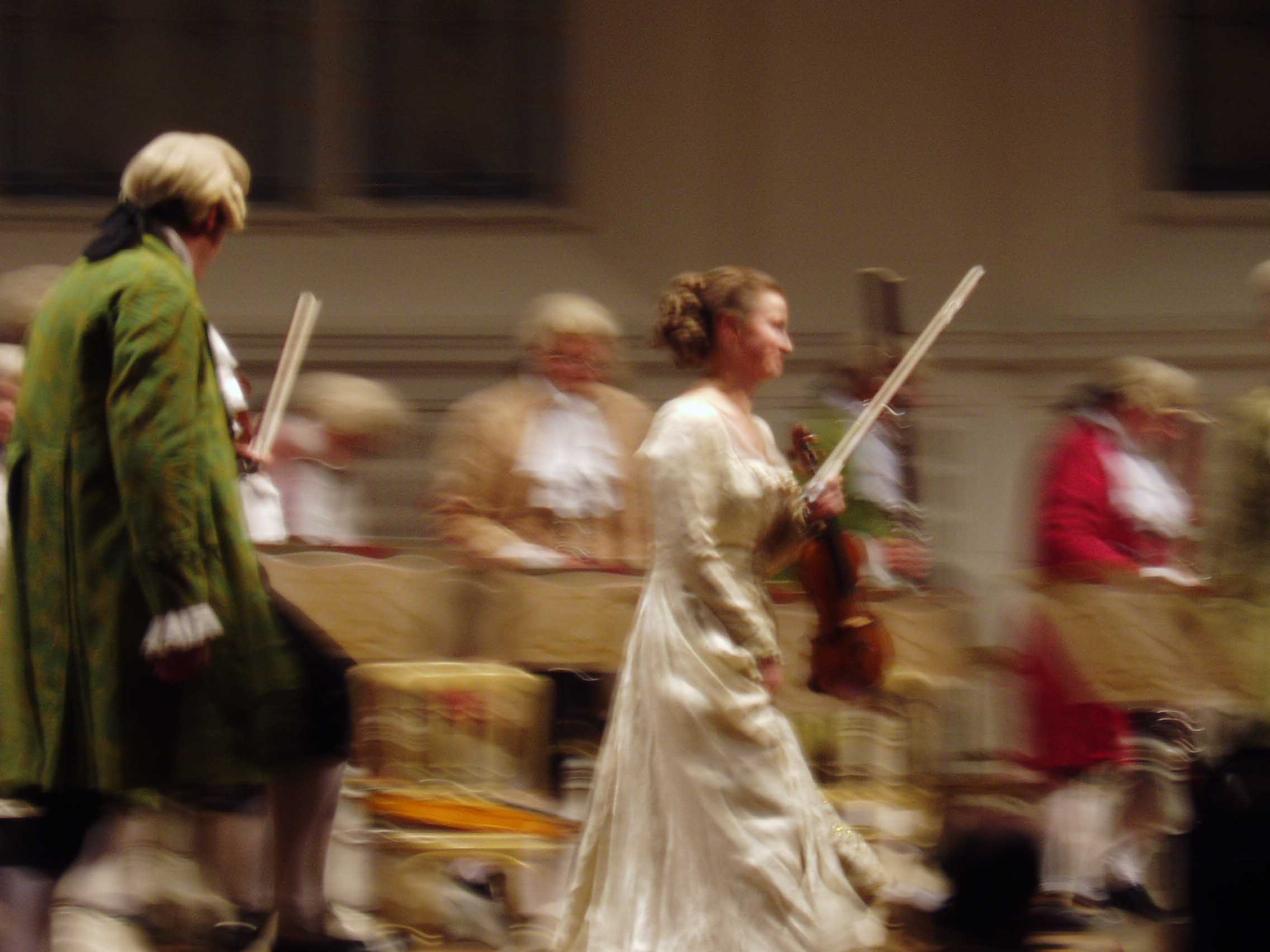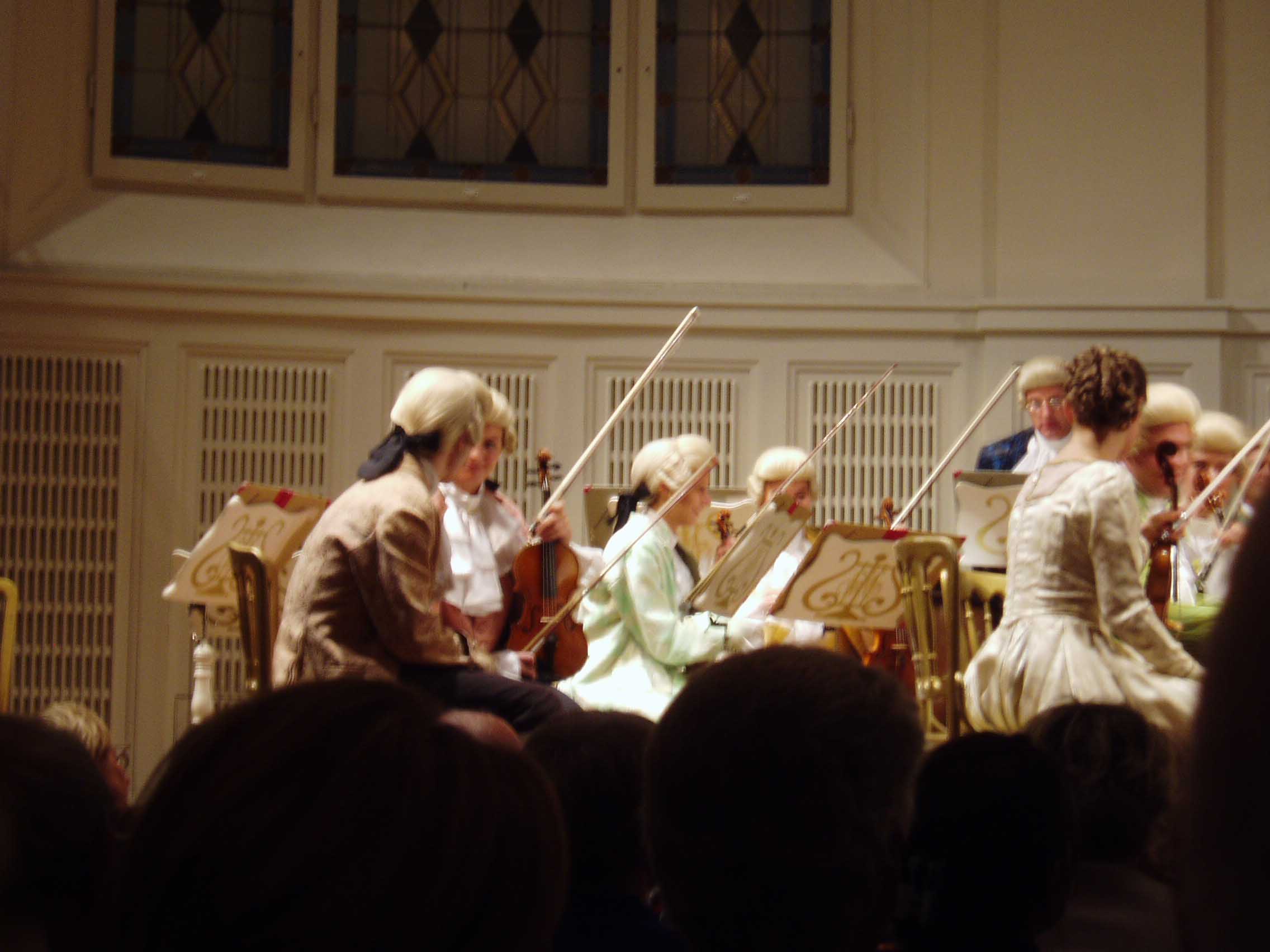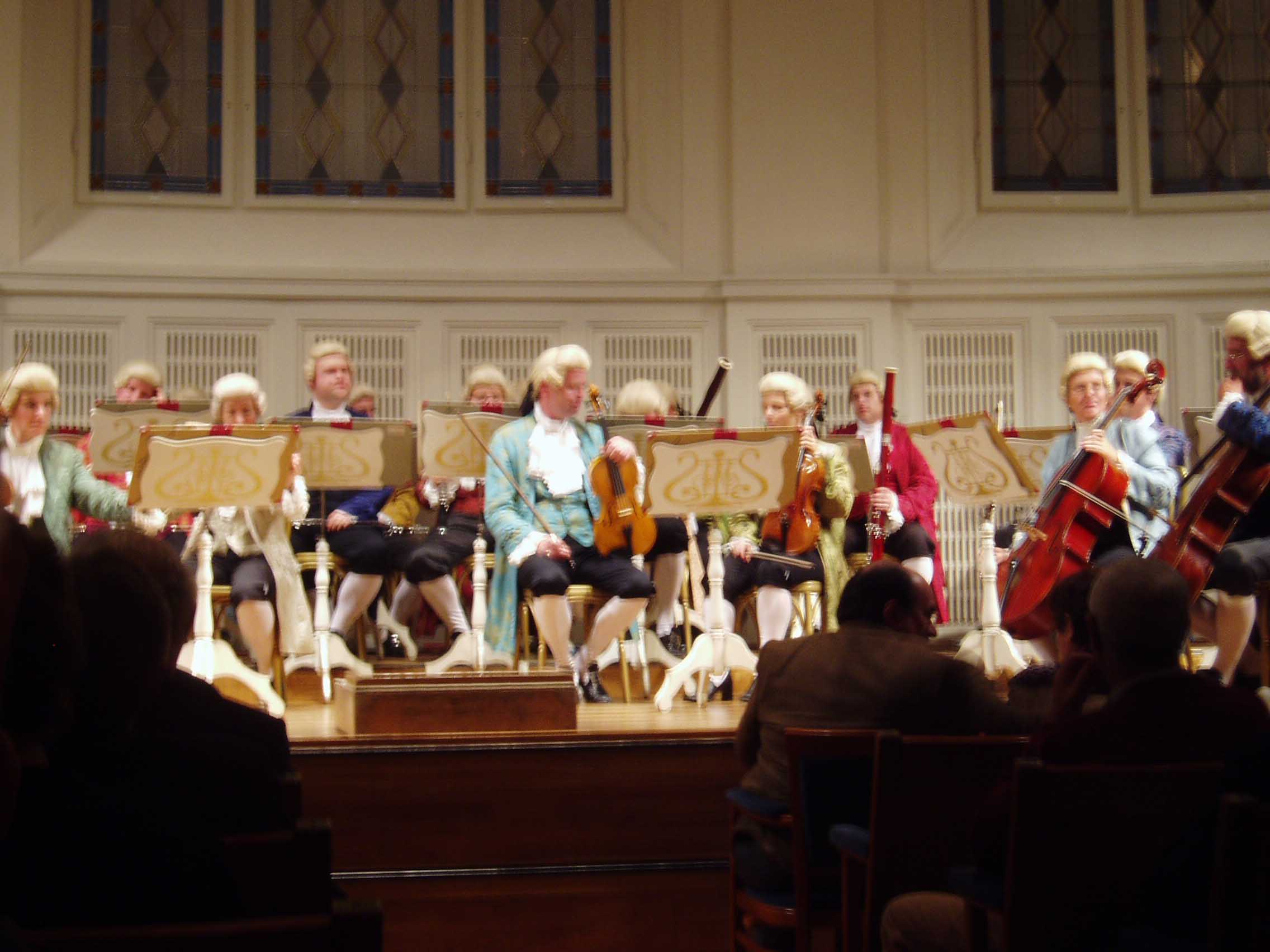 今夜のコンサートは、コンツェルトハウスのモーツァルト・ ザールで行われる。ホール自体はそれ程大きくない。 演奏するのはモーツァルト当時の衣装を再現して演奏する「モーツァル ト・ヒストリカルオーケストラ」という団体である。要はコスプレということになるのだろうが・・・。演奏会自体は、娯楽性の高いものだった。演奏 会の最中 でもみんな平気で写真を撮っており、オーケストラ側もそれを黙認していた。衣装はとても凝っていたが、楽器はモダン楽器が使用されており、 あまり一貫性は なかった。「教養ある遊び」的な感覚なのだろう。エンターテイメントとしては最高級のものだった。演奏はすばらしく、音も「ウィーンの音」と良く言われる 柔らかい音色だった。ヴァイオリン協奏曲第5番「トルコ風」(モーツァルト)のソロを弾いたBettina Gradingerの演奏が特に素晴らしく、フレージングがとても自然だった。モーツァルトの音楽として音楽的にとても聞きやすかった。また、音 にとても エネルギーがあった。残念だったのはカデンツァを弾いてくれなかったことくらい。ウィーンには名前の売れていない名手がたくさんいると聞いたことがある が、彼女もそのうちの一人だろう。アンコールはラデツキー行進曲だったが、指揮者が観客の拍手を指揮していて、途中で指揮棒を隠したり出したりしながら遊 んでいたのが印象的だった。