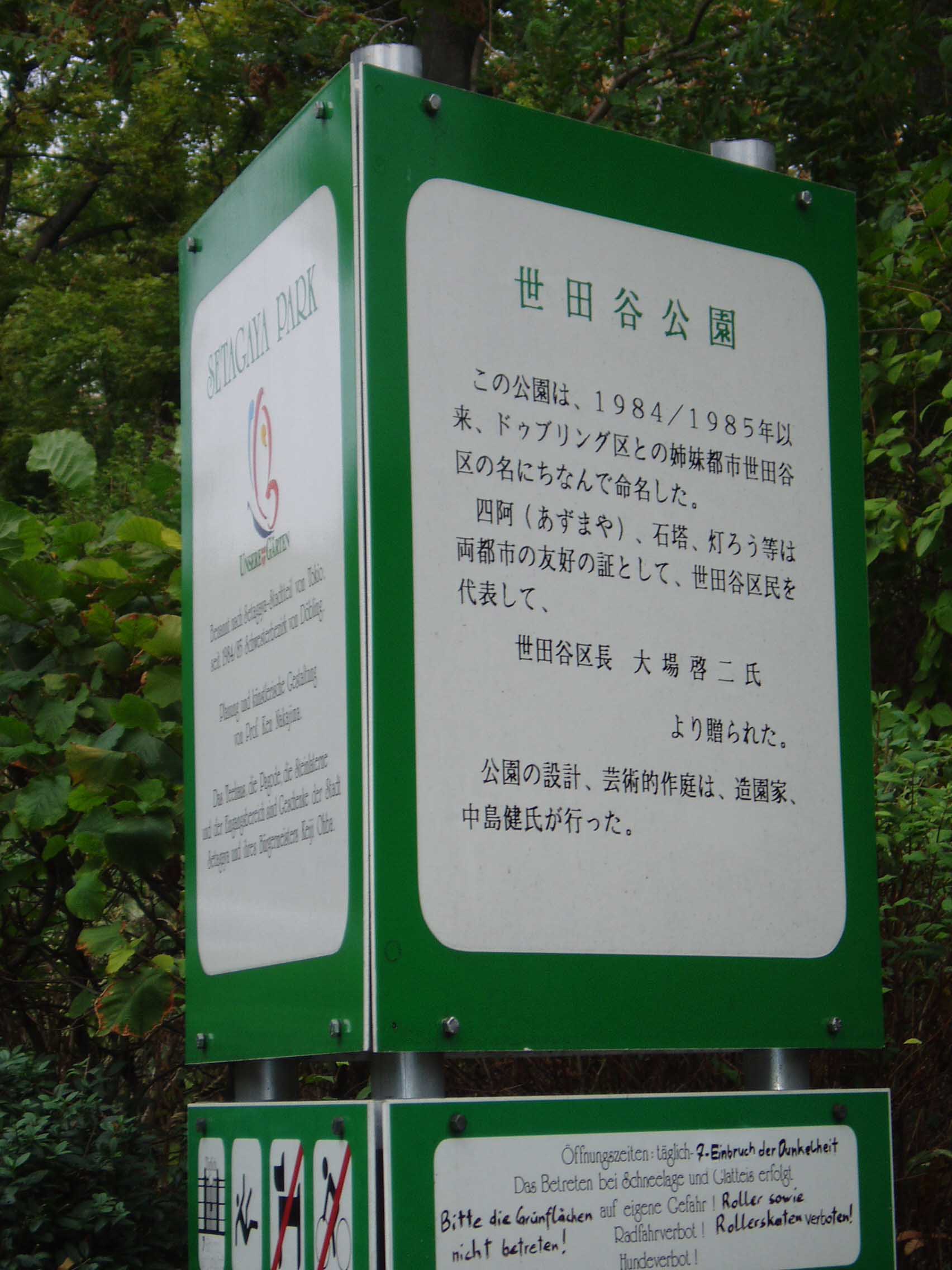 数キロ離れたところに、ベートーヴェンが交響曲第3番「英雄(エロイカ)」を作曲した時に住んでいたとされる家があり、そこまで歩く。起伏に富ん だ地形で、楽器を持って歩くには 辛い。いろいろな人に道を聞きながら少しずつ進む。途中で日本風な建物を 発見。「世田谷公園」と標識が出ている。東京の世田谷区とウィー ンが姉妹都 市の契 約を交わしたことで建てられたそうである。