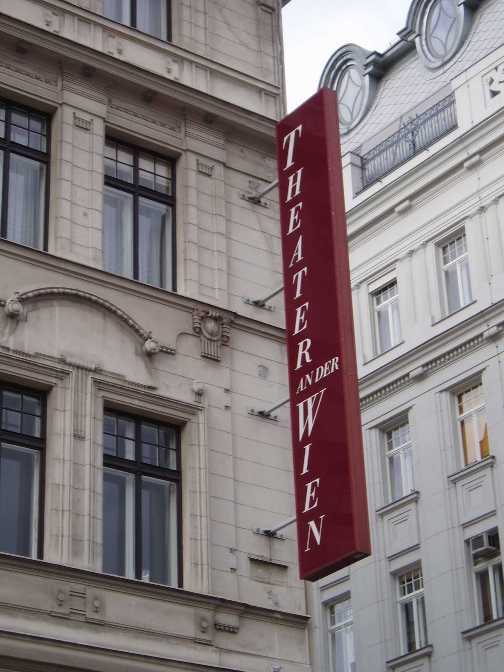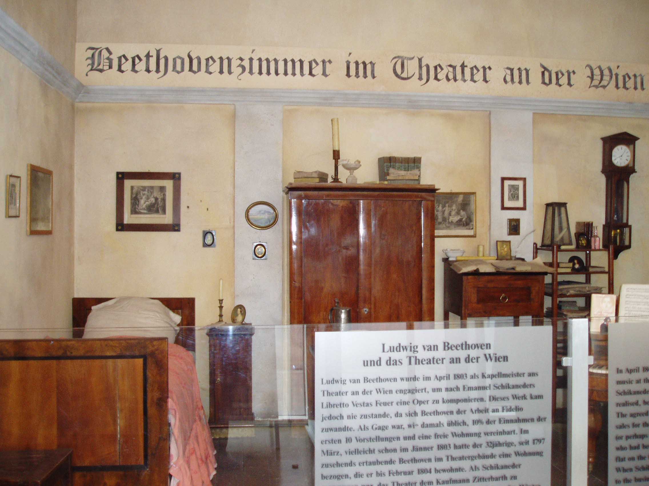 Karsplatsの駅に戻り「アン・デア・ウィーン劇場」に 向かった。立派な看板が出ている。この劇場にはベートーヴェンが 1803年と1804年に住んだことがあ り、ここで初演された作品としては「交響曲第2、3、5、6番」、「ピアノ協奏曲第3、4番」、「ヴァイオリン協奏曲」などが知られている。入り口を入る と、一角にベートーヴェンが住んだ当時の風景が再現されていた。
