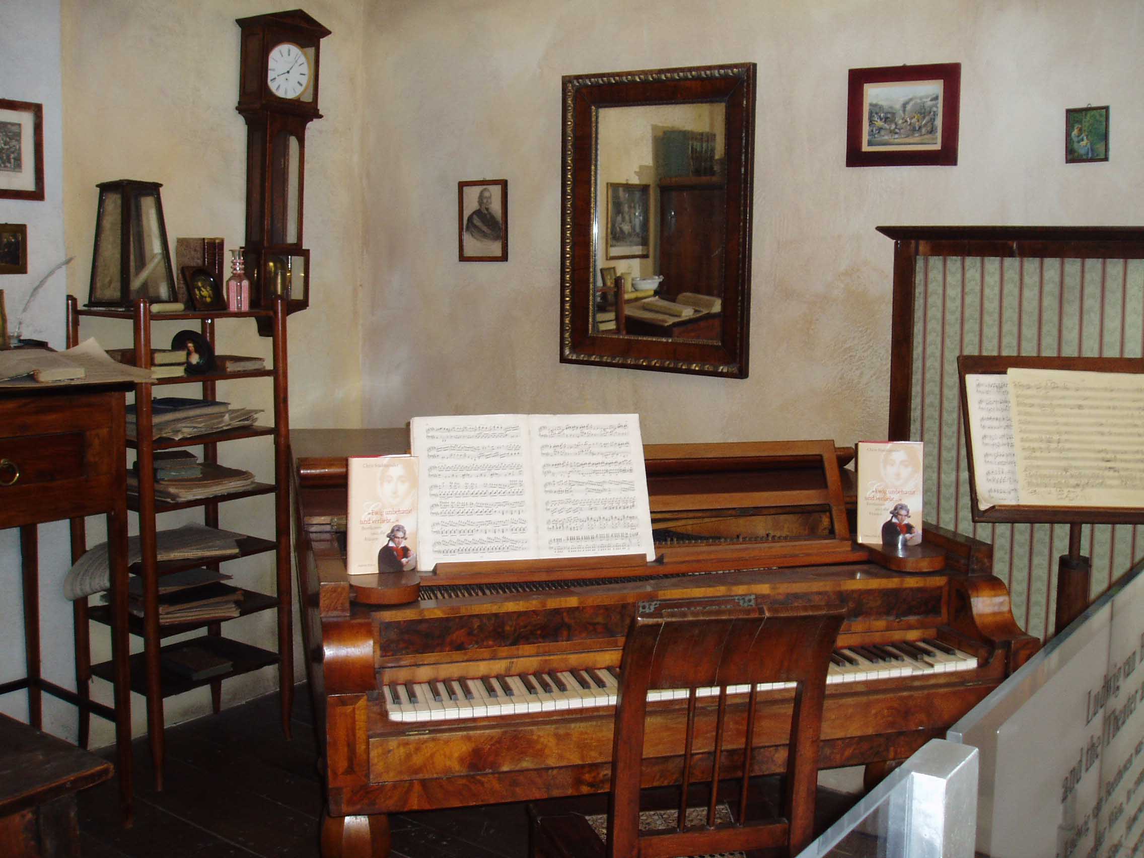 丘を越え、橋を渡り、坂道を上った中腹に協会があり、その手前に目指す「エロイカハウス」はあった。看板や銘板も表示されている。ベートーヴェンが交響曲第3番「英雄(エ ロイ カ)」を作曲したといわれる家だ。諸説あり本当のことはわからない。しかし、1803年当時、この彼が近辺に住んでいたことは間違いない。「デーブリン グ」と呼ばれる地域だ。通りからひとしきり家を眺めた後、門をくぐると中 庭があり、そこから建物に入り階段を上ると受付があった。部屋 は3室からなり、第 1、3室は土地の気風を表す展示。また、この時期にスケッチがされていた「ワルトシュタイン・ソナタ」のファクシミリも展示されていた。「ワルトシュタイ ン・ソナタ」は、パリの「セバスチャン・エラール」から贈られた新型ピアノの影響を強く受けていると言われている。広い音域や、ペダルの発達により、ピア ノ音楽の可能性が更に広がったのだ。ベートーヴェンはこの時期に、「交響曲第5番『運命』」や「ピアノ協奏曲第4番」といった曲のスケッチも始めていたそ うである。第2室には「エロイカ」のファクシミリが展示されていた。彼がここに住んでいた1803年というのは、「クロイツェル・ソナタ」が初演された年 でもあり、次に続く「傑作の森」と呼ばれる黄金期への予兆が感じられる。