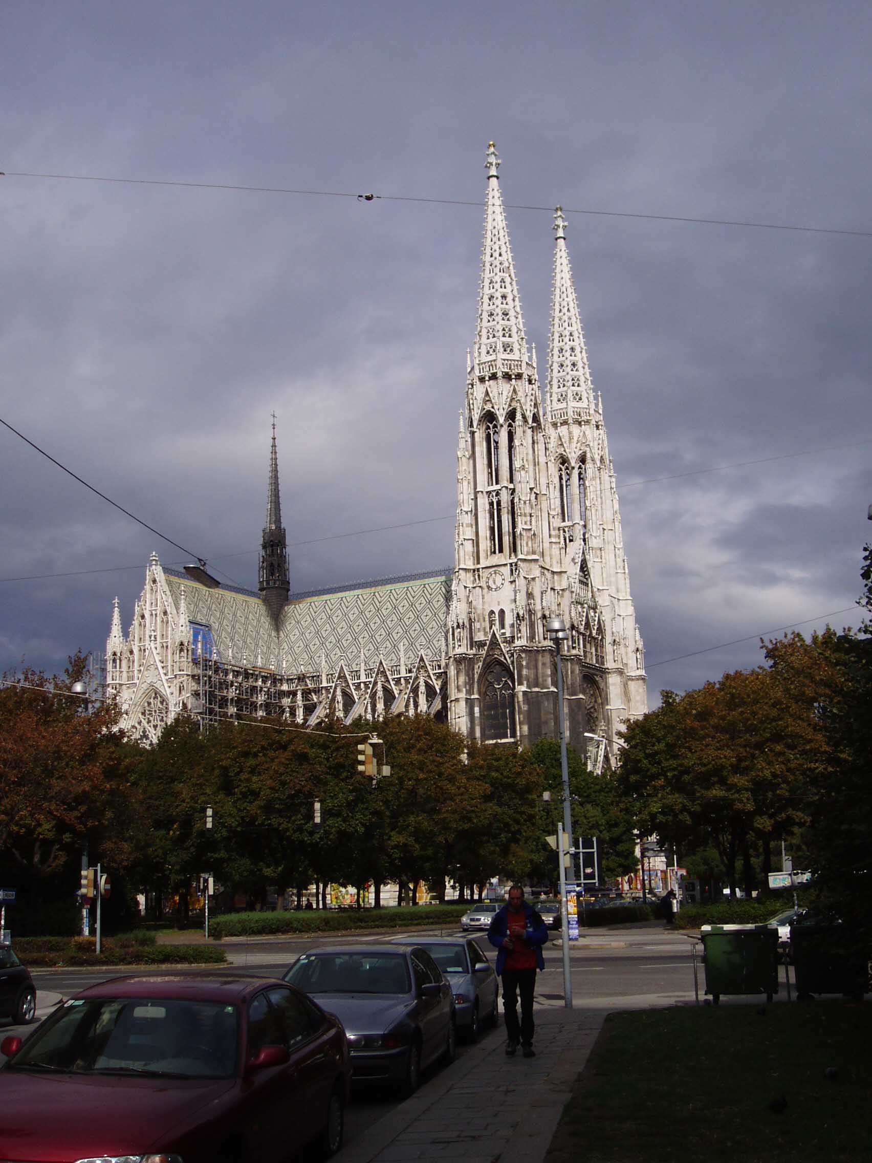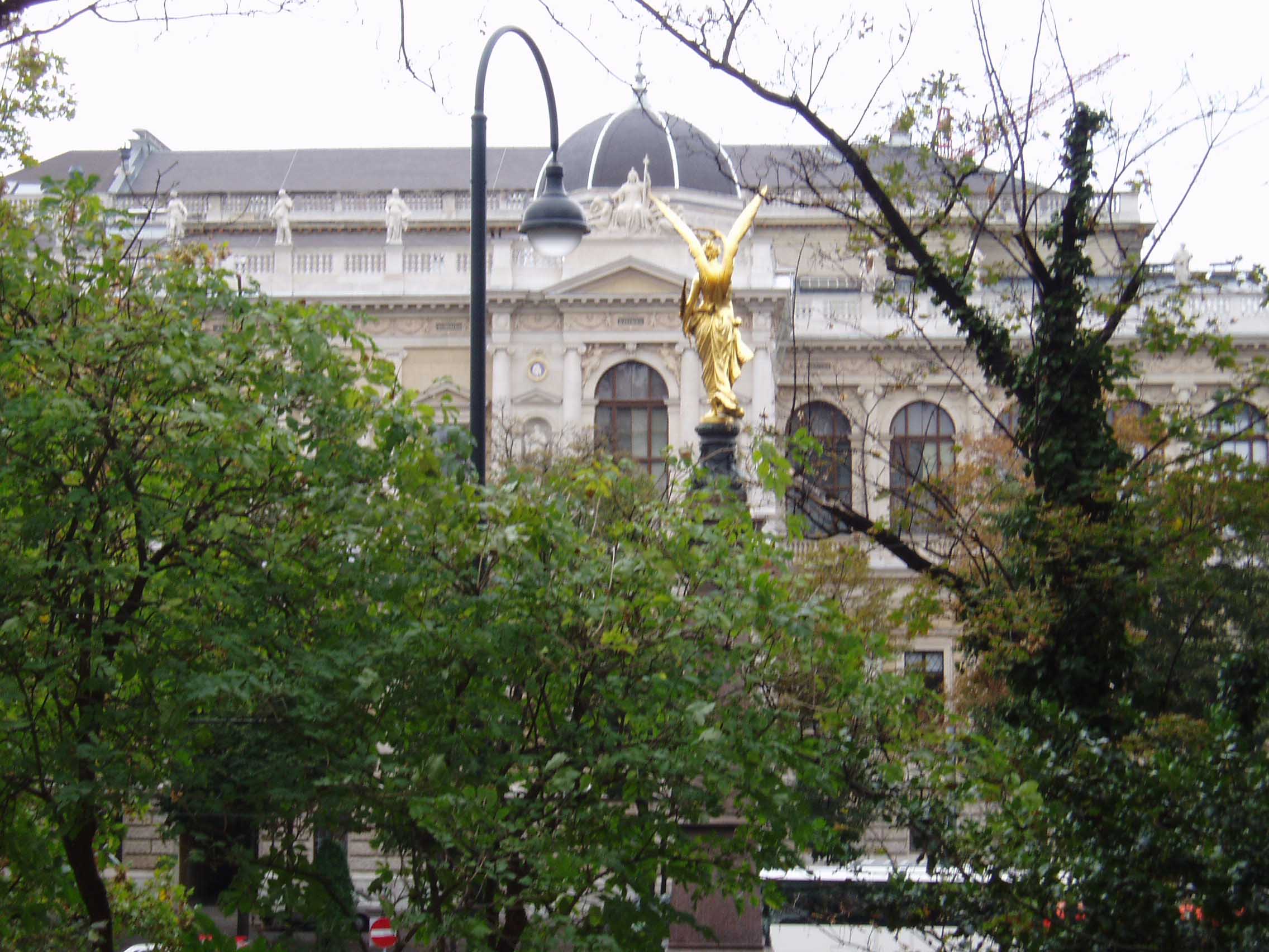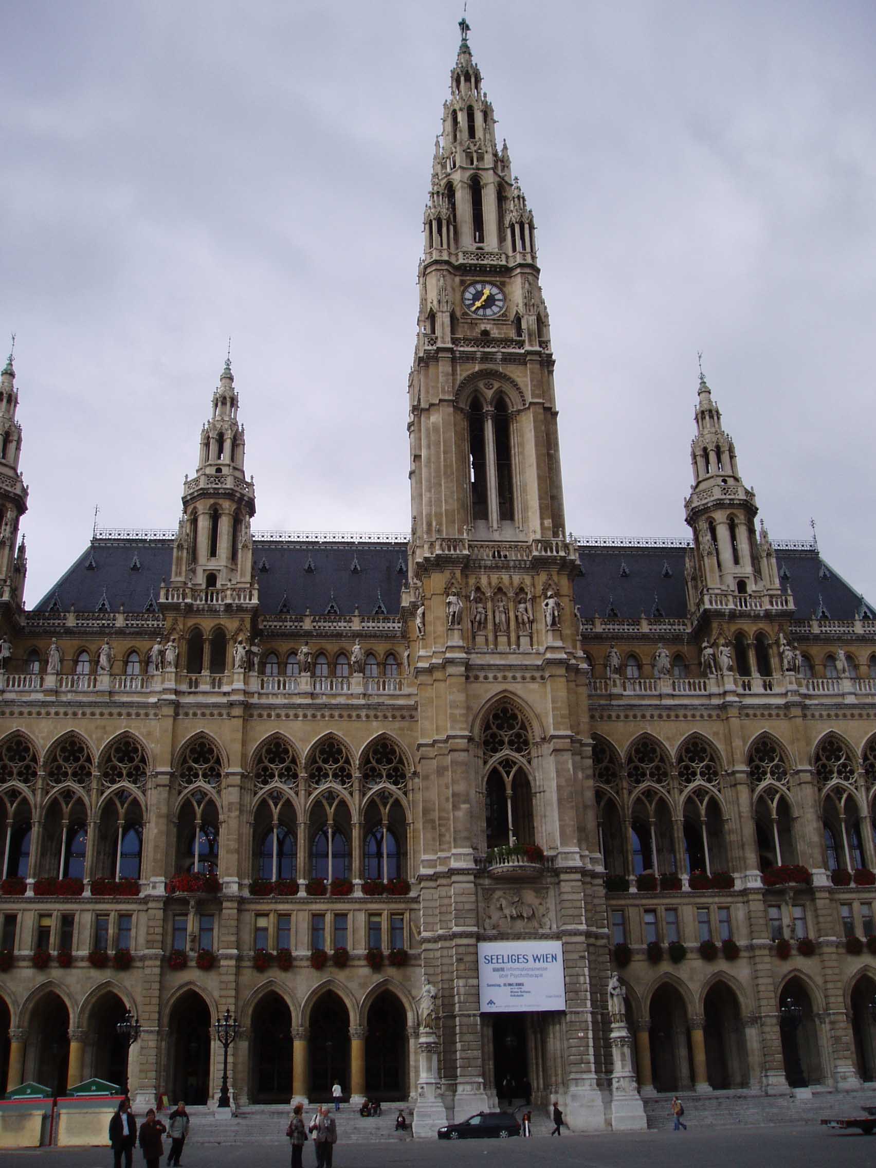 ヴォティーフ教会を右手に、ウィーン大学を左手に進 み、市庁舎(Rathhaus)にたどり着いた。市庁舎周辺はかな り広い敷地になっ ていて、公園もあった。公園の中には、音楽家の銅像も建っていた。市庁舎に向かって右手がウィーン大学、左手が国会議事堂である。