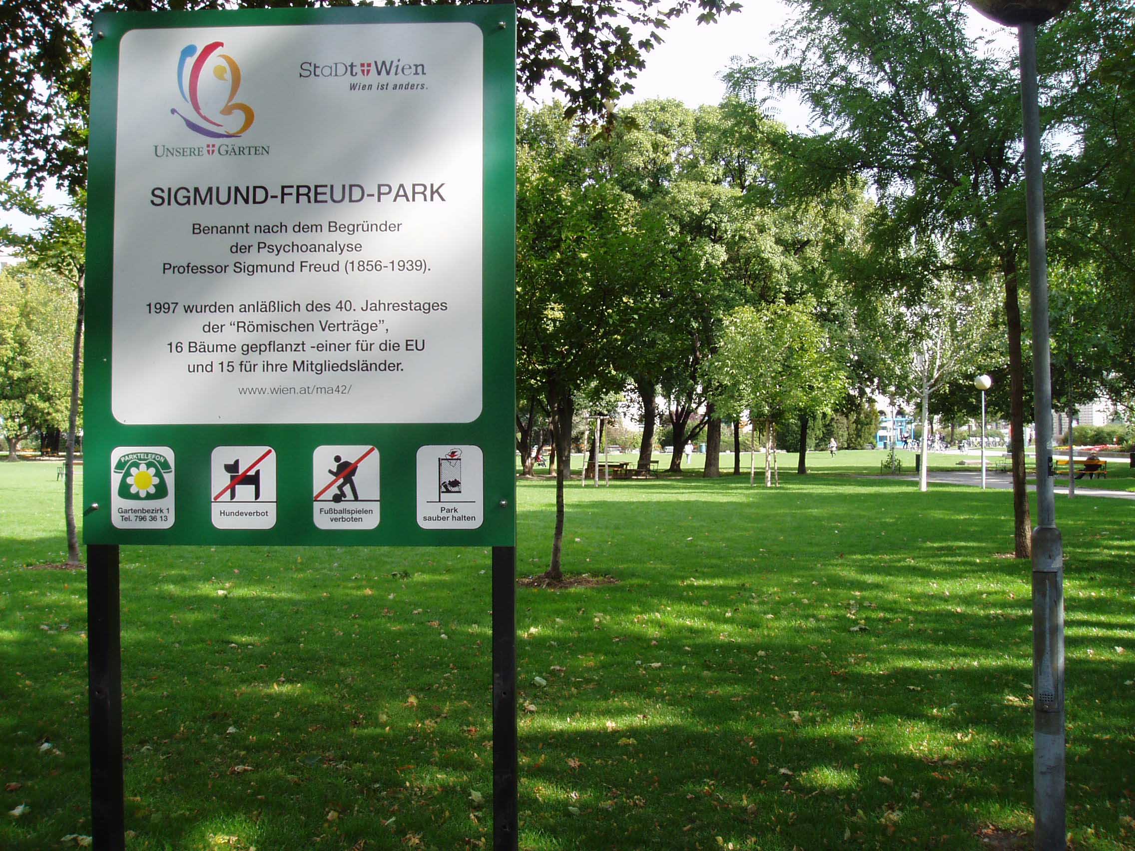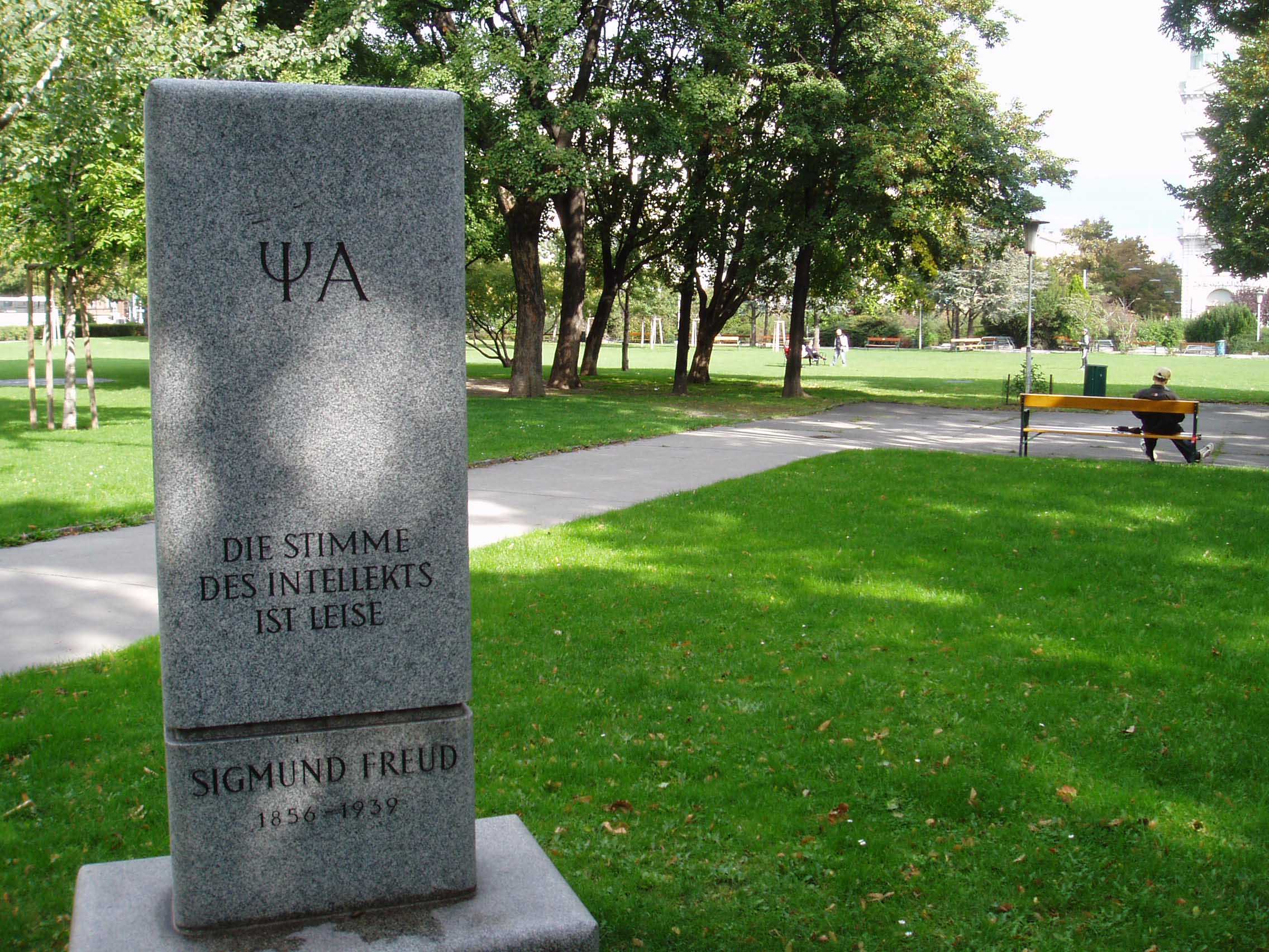 建物の2階がフロイト記念館になっていた。受付でロッカーに荷物を入れるように指示さ れ、入場料を払って中に入る。フロイトの書斎や待合室、診察 室を見学した。家の内装はとても落ち着いた雰囲気で、患者達もリラックス出来ただろうと思う。記念館自体はそれ程広くなかったが、見学客がたくさんいた。 記念館から市庁舎に向けて歩く途中に「ジグムント・フロイト公園」が あった。歩き疲れてベンチで少し休んだ。10月ともなると空気はかなり 冷たかったが、 日は差しており、まばらに人の姿も見えた。