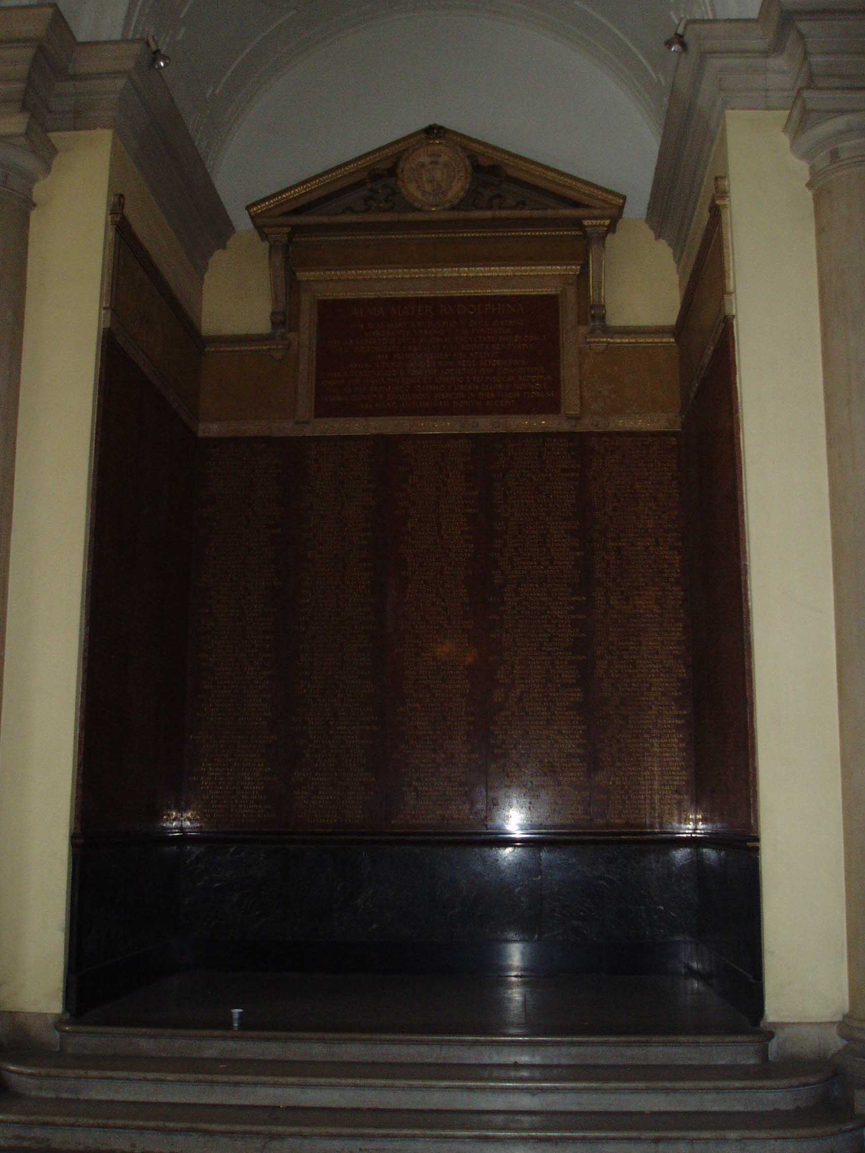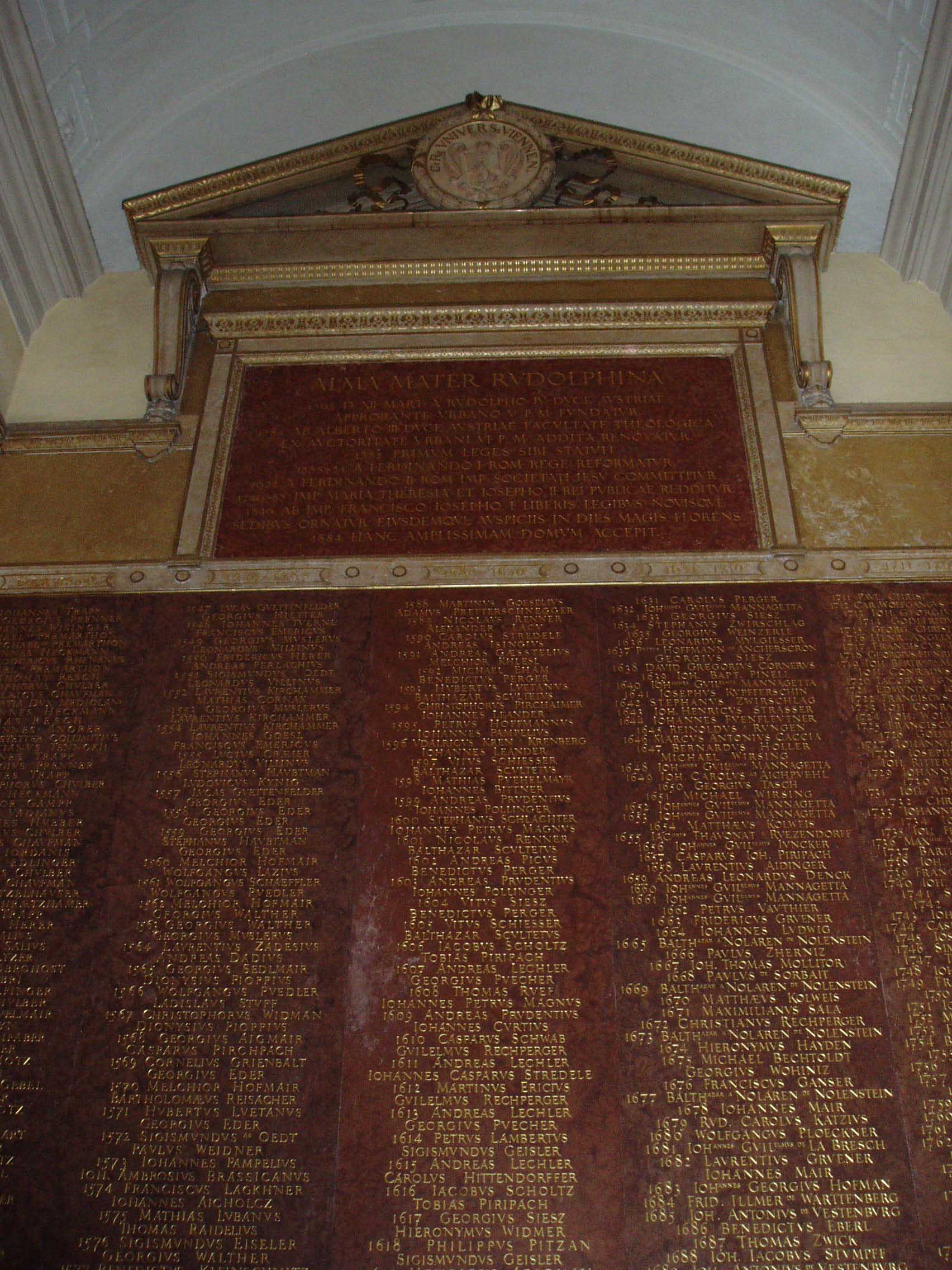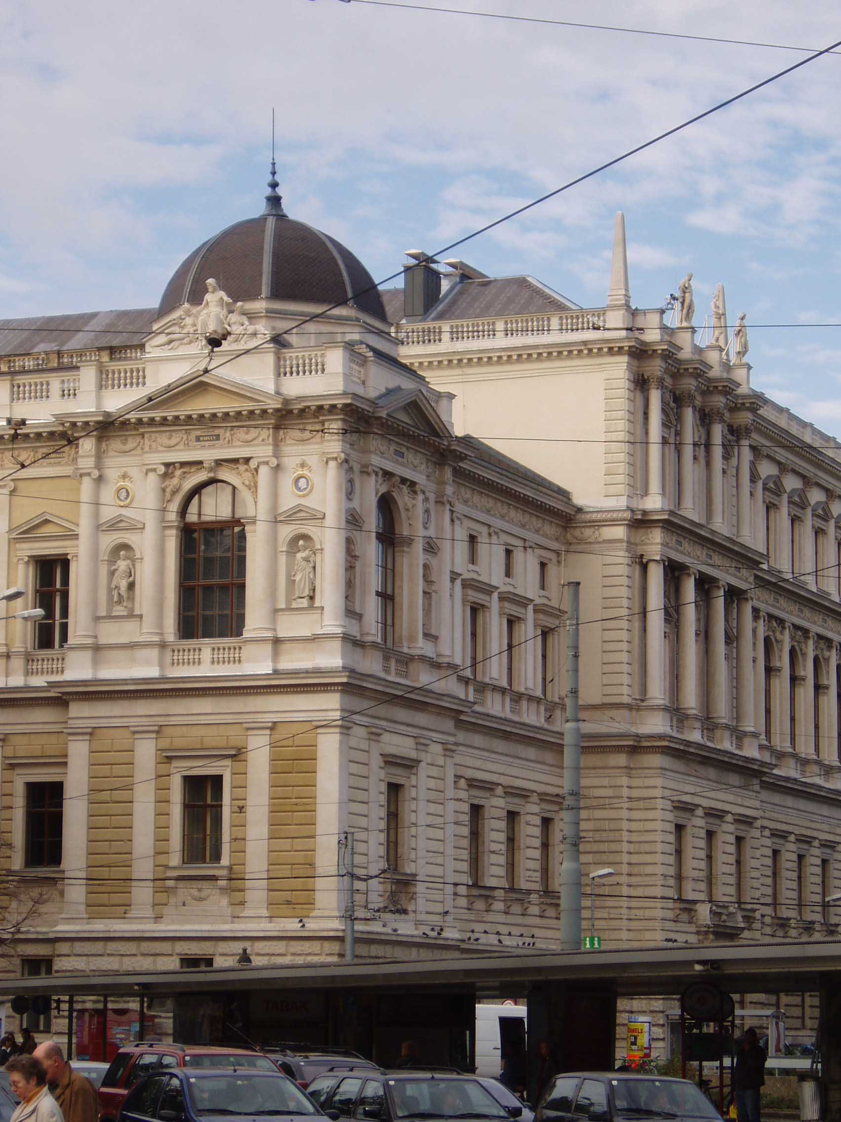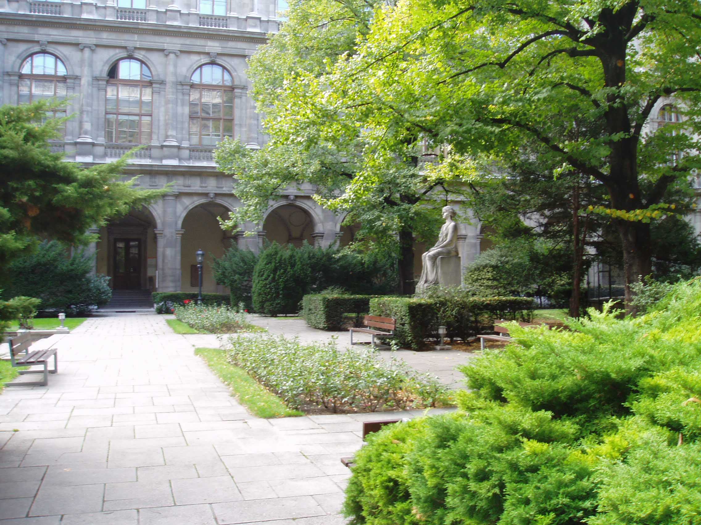 ウィーン大学は1365年に創設され、現在の建物は1884年に建てられたものだ。天使の彫像が建物の屋上を縁取っている。上り、建物の中 に入ると、右手に掲示板がある。左手には創学以来、毎年一人ずつの名前が彫られた石版がある。成績優秀者の名前だろうか。正面は中庭になっている。中庭に 出ると回廊があった。回廊にはウィーン大学を代表する偉人達 の彫像がずらりと並べられていた。そのうち一部の名前を挙げてみよう。「SEMMELWEIS (産褥熱の原因を突き止め、無菌法を実践)」「KAPOSI(カ ポジ肉腫を発見)」「SCHRODINGER(シュレディ ンガー方程式で有名)」 「DOPPLER(ドップラー効果で有名)」「MEYNERT(脳解剖学で有名な『マイネルトの基底核』で知 られる)」「FREUD(精神分析学の祖)」 「HANSLICK(ブラームスの親友で音楽批評家)」「ROKITANSKY(解剖学のロキタンスキー・アショッフ洞 で知られる他、ベートーヴェンの剖 検など)」「BILLROTH(現在でも使われる胃癌の術 式を開発し『近代外科学の父』と呼ばれる)」。歴史の重みがずしりと伝わってくる。日本にこれ程 の伝統を持った大学はない。