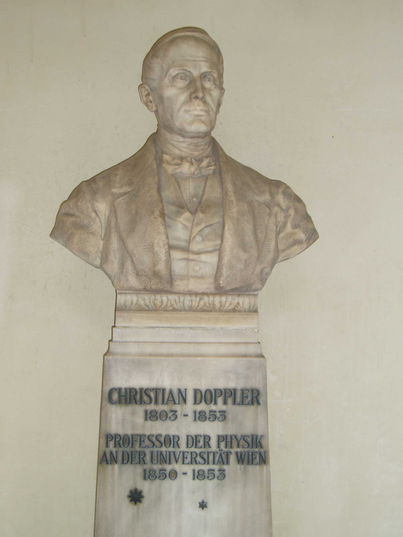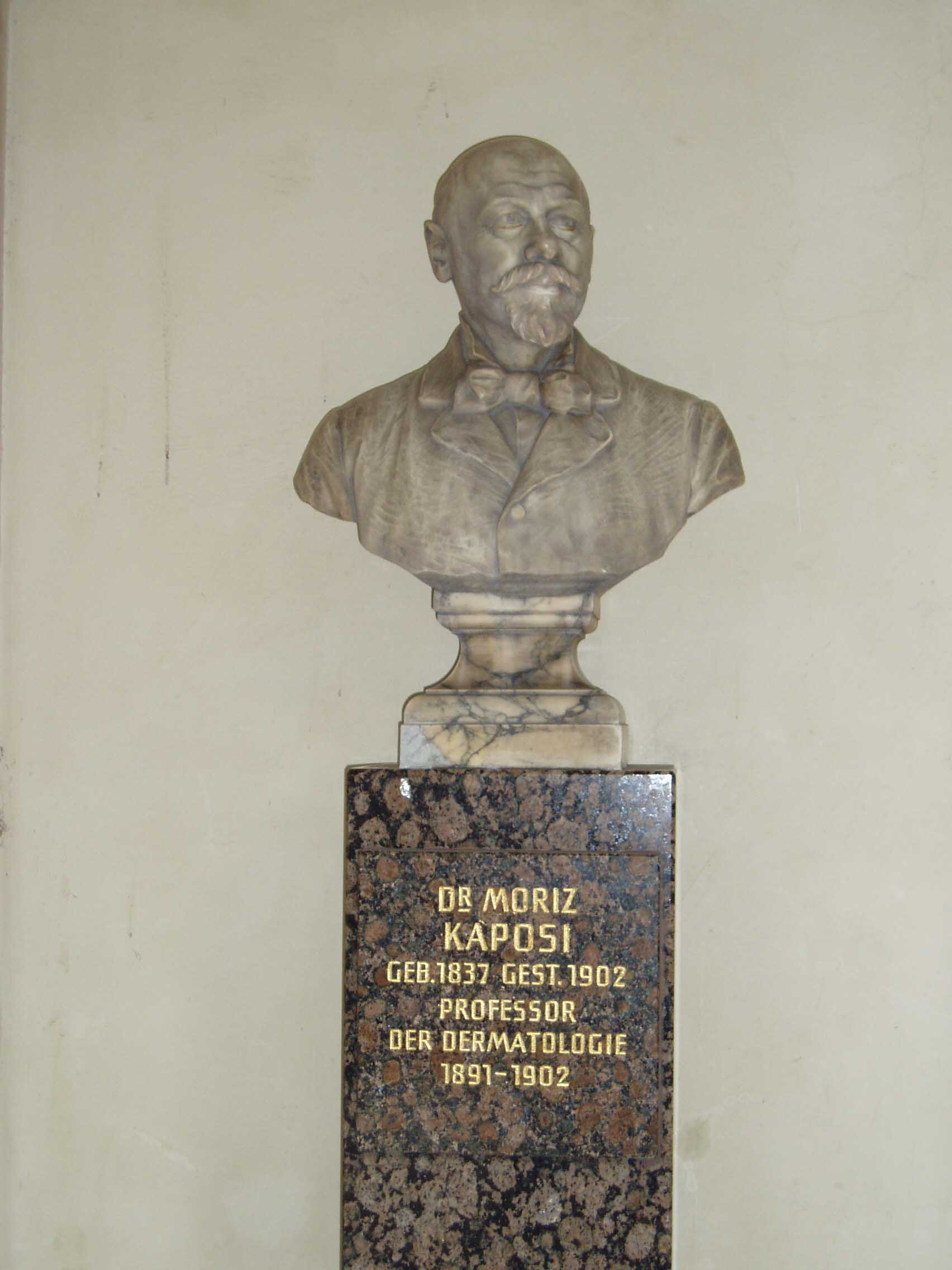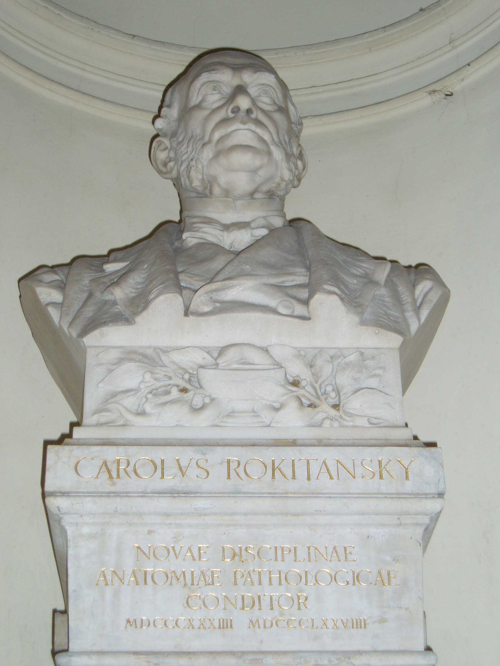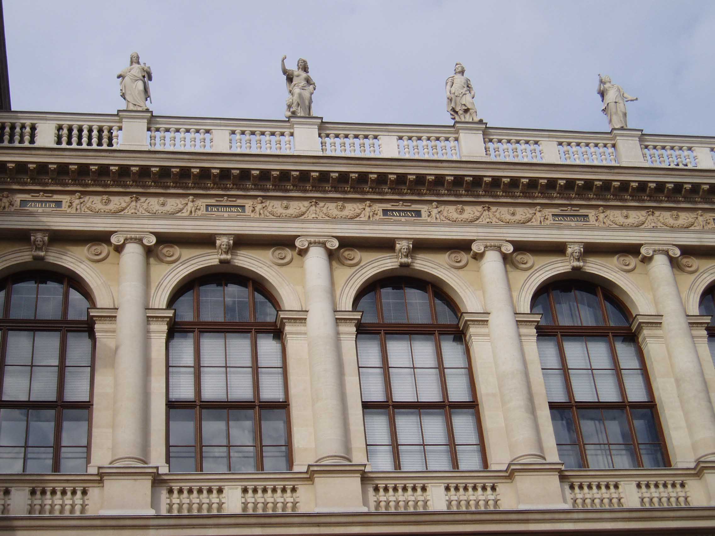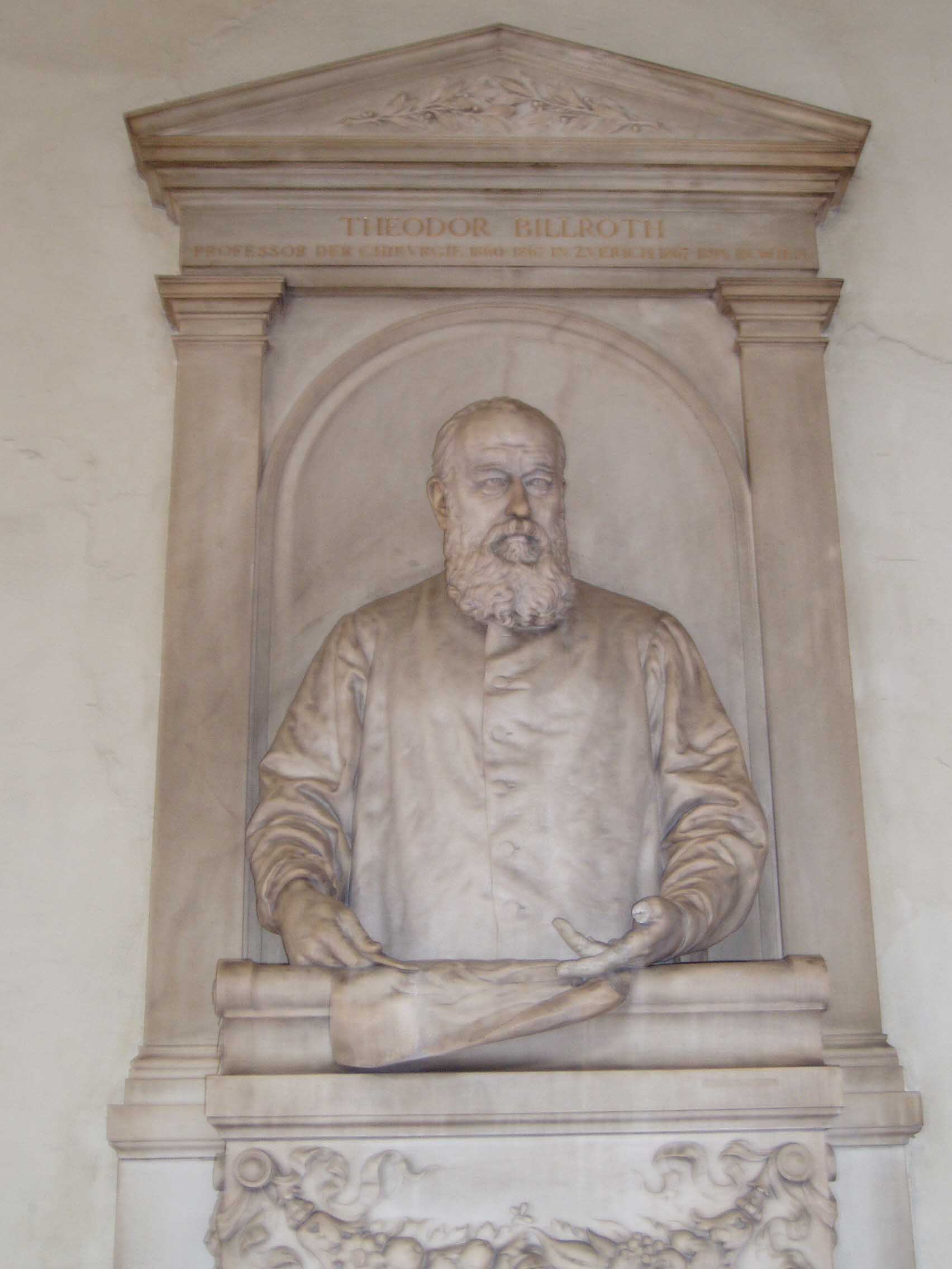 ウィーン大学は1365年に創設され、現在の建物は1884年に建てられたものだ。天使の彫像が建物の屋上を縁取っている。上り、建物の中 に入ると、右手に掲示板がある。左手には創学以来、毎年一人ずつの名前が彫られた石版がある。成績優秀者の名前だろうか。正面は中庭になっている。中庭に 出ると回廊があった。回廊にはウィーン大学を代表する偉人達 の彫像がずらりと並べられていた。そのうち一部の名前を挙げてみよう。「SEMMELWEIS (産褥熱の原因を突き止め、無菌法を実践)」「KAPOSI(カ ポジ肉腫を発見)」「SCHRODINGER(シュレディ ンガー方程式で有名)」 「DOPPLER(ドップラー効果で有名)」「MEYNERT(脳解剖学で有名な『マイネルトの基底核』で知 られる)」「FREUD(精神分析学の祖)」 「HANSLICK(ブラームスの親友で音楽批評家)」「ROKITANSKY(解剖学のロキタンスキー・アショッフ洞 で知られる他、ベートーヴェンの剖 検など)」「BILLROTH(現在でも使われる胃癌の術 式を開発し『近代外科学の父』と呼ばれる)」。歴史の重みがずしりと伝わってくる。日本にこれ程 の伝統を持った大学はない。
